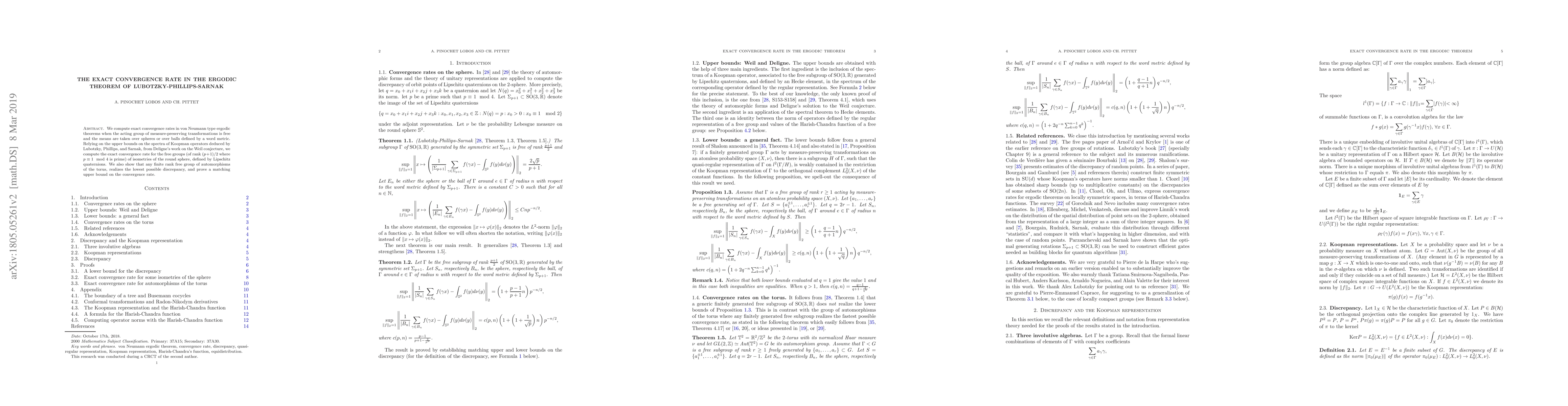 The paper computes exact convergence rates for ergodic theorems on free groups of isometries of the round sphere and torus, improving previous bounds with a new approach using Deligne's work on the Weil conjecture.