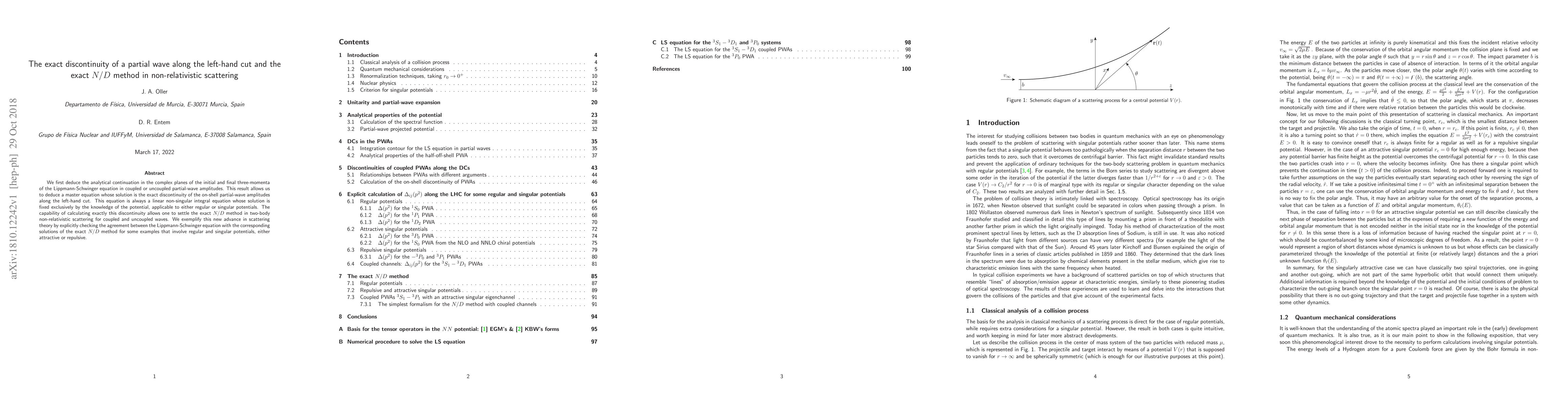 We first deduce the analytical continuation in the complex planes of the initial and final three-momenta of the Lippmann-Schwinger equation in coupled or uncoupled partial-wave amplitudes. This result allows us to deduce a master equation whose solution is the exact discontinuity of the on-shell partial-wave amplitudes along the left-hand cut. This equation is always a linear non-singular integral equation whose solution is fixed exclusively by the knowledge of the potential, applicable to either regular or singular potentials. The capability of calculating exactly this discontinuity allows one to settle the exact $N/D $ method in two-body non-relativistic scattering for coupled and uncoupled waves. We exemplify this new advance in scattering theory by explicitly checking the agreement between the Lippmann-Schwinger equation with the corresponding solutions of the exact $N/D$ method for some examples that involve regular and singular potentials, either attractive or repulsive.