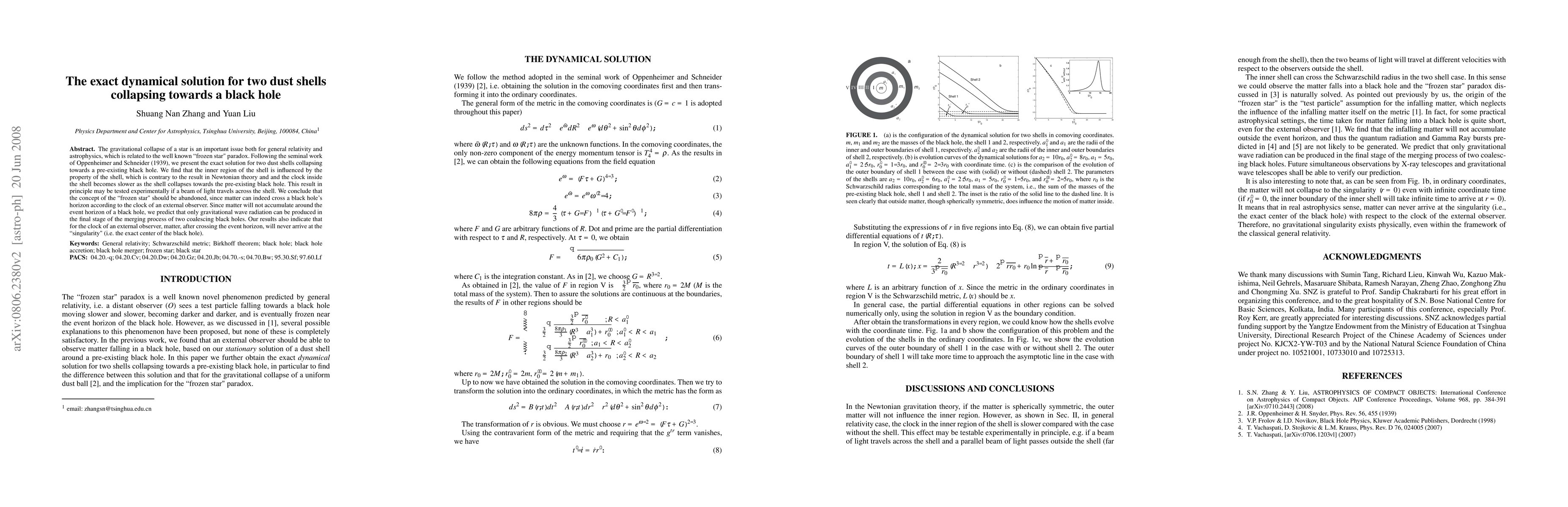 This research presents an exact solution for two dust shells collapsing towards a black hole, challenging the 'frozen star' paradox. It concludes matter crosses the event horizon as observed by external clocks, predicting only gravitational waves in the final stage of two black hole merging, and no matter reaching the singularity.