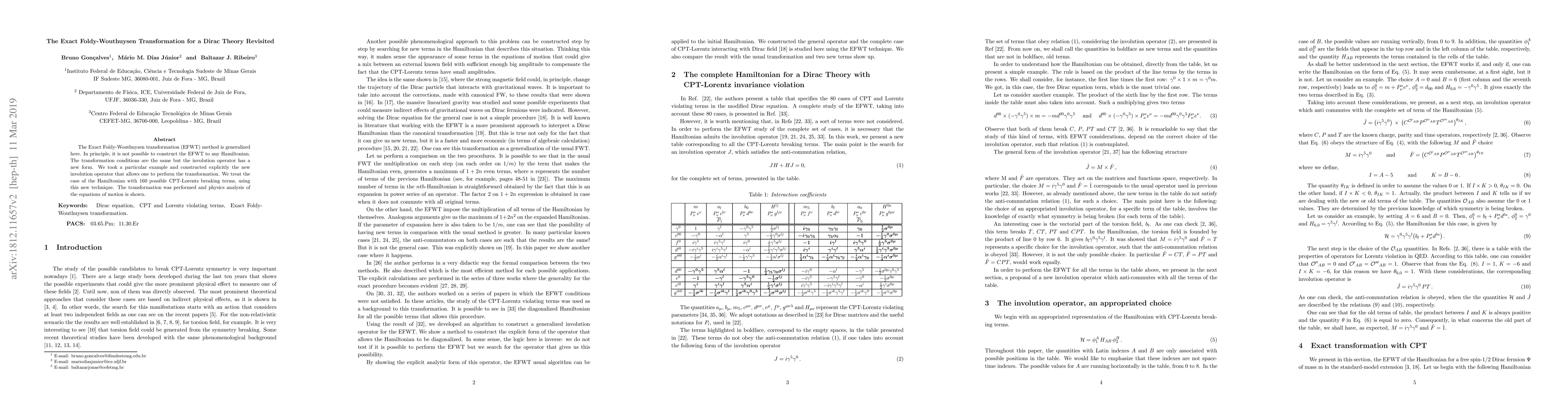 This paper generalizes the Exact Foldy-Wouthuysen transformation (EFWT) for Dirac theory, introducing a new involution operator for specific Hamiltonians. The authors apply this technique to a Hamiltonian with 160 CPT-Lorentz breaking terms, demonstrating the transformation and analyzing the resulting equations of motion.