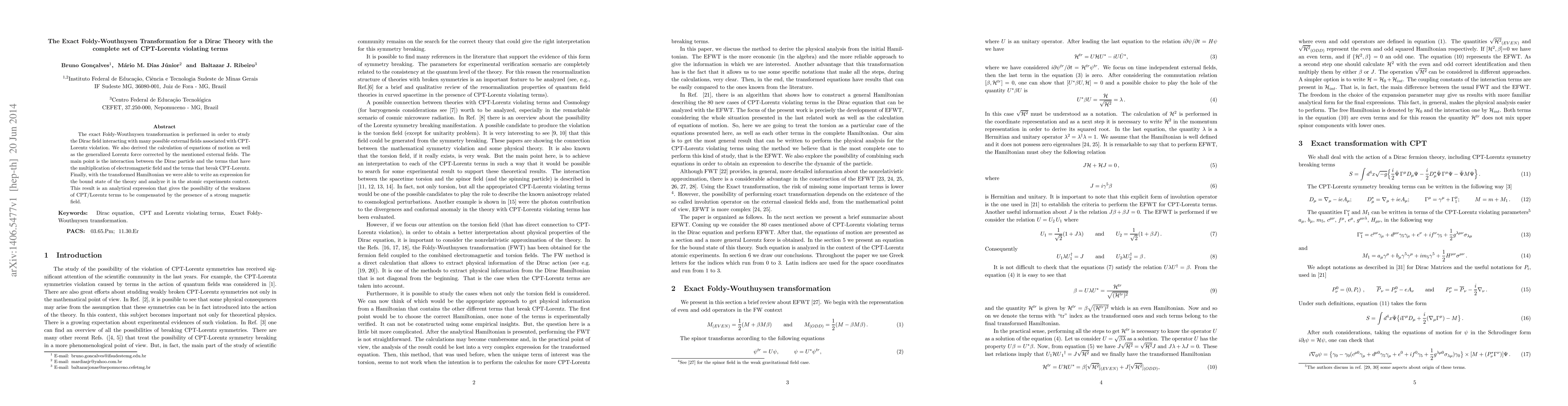 The paper performs an exact Foldy-Wouthuysen transformation on a Dirac theory incorporating CPT-Lorentz violating terms, deriving equations of motion and a generalized Lorentz force. It concludes with an analytical expression for the bound state, revealing that strong magnetic fields can compensate for the weak CPT/Lorentz violations.