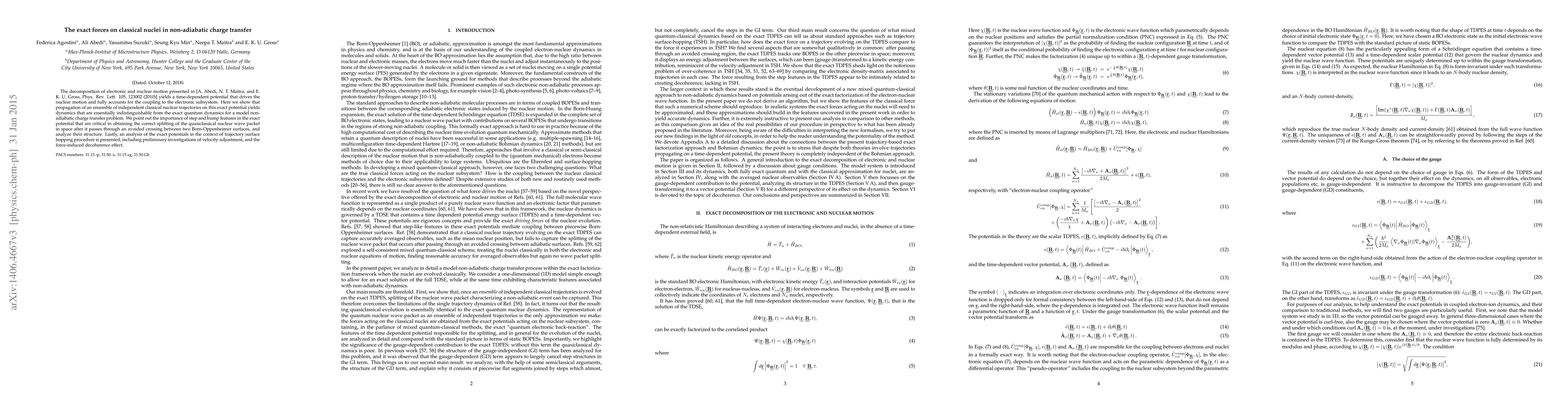 The decomposition of electronic and nuclear motion presented in~[A. Abedi, N. T. Maitra, and E. K. U. Gross, Phys. Rev. Lett. 105, 123002 (2010)] yields a time-dependent potential that drives the nuclear motion and fully accounts for the coupling to the electronic subsystem. Here we show that propagation of an ensemble of independent classical nuclear trajectories on this exact potential yields dynamics that are essentially indistinguishable from the exact quantum dynamics for a model non-adiabatic charge transfer problem. We point out the importance of step and bump features in the exact potential that are critical in obtaining the correct splitting of the quasiclassical nuclear wave packet in space after it passes through an avoided crossing between two Born-Oppenheimer surfaces, and analyze their structure. Lastly, an analysis of the exact potentials in the context of trajectory surface hopping procedure is presented, including preliminary investigations of velocity-adjustment, and the force-induced decoherence effect.