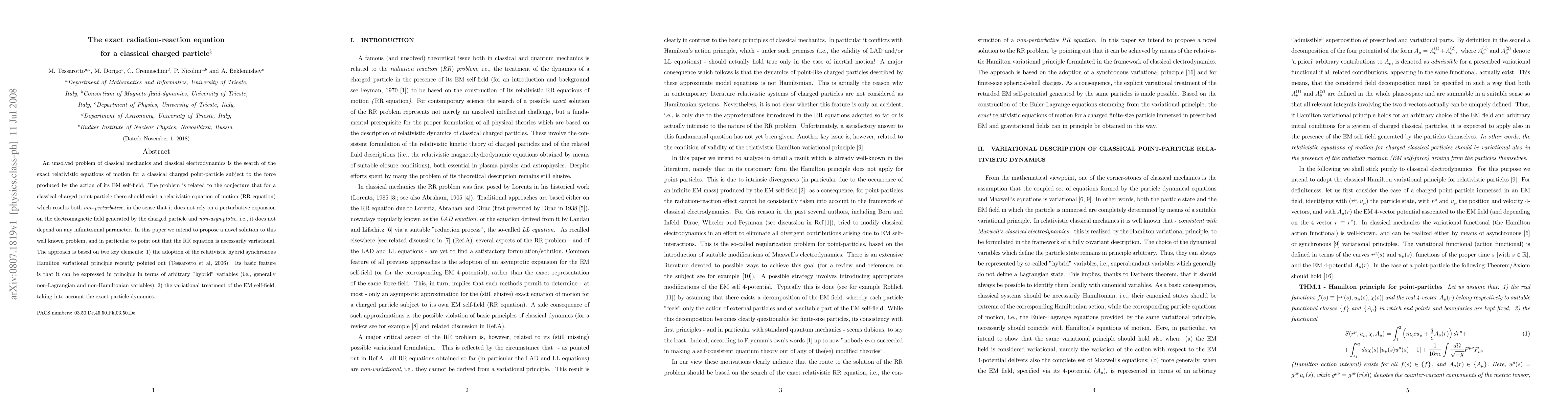 An unsolved problem of classical mechanics and classical electrodynamics is the search of the exact relativistic equations of motion for a classical charged point-particle subject to the force produced by the action of its EM self-field. The problem is related to the conjecture that for a classical charged point-particle there should exist a relativistic equation of motion (RR equation) which results both non-perturbative, in the sense that it does not rely on a perturbative expansion on the electromagnetic field generated by the charged particle and non-asymptotic, i.e., it does not depend on any infinitesimal parameter. In this paper we intend to propose a novel solution to this well known problem, and in particular to point out that the RR equation is necessarily variational. The approach is based on two key elements: 1) the adoption of the relativistic hybrid synchronous Hamilton variational principle recently pointed out (Tessarotto et al, 2006). Its basic feature is that it can be expressed in principle in terms of arbitrary "hybrid" variables (i.e., generally non-Lagrangian and non-Hamiltonian variables); 2) the variational treatment of the EM self-field, taking into account the exact particle dynamics.