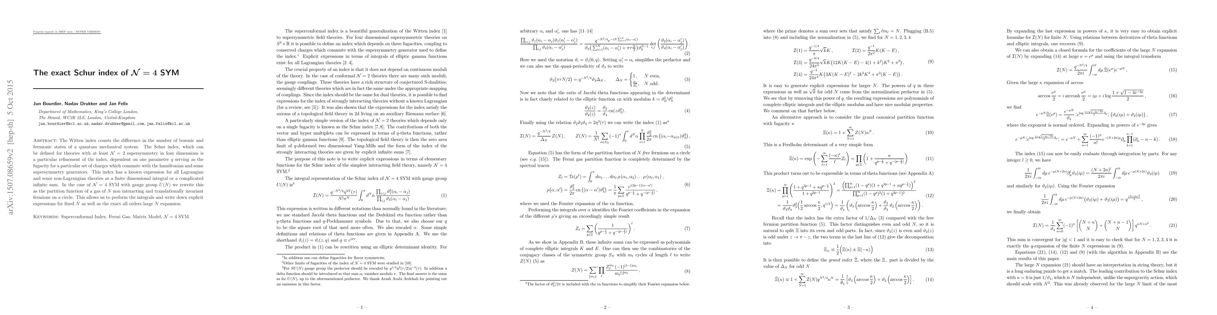 This paper derives the exact Schur index for $\mathcal{N}=4$ supersymmetric Yang-Mills (SYM) theory, presenting an explicit expression both for finite $N$ and for large $N$ expansions, using the partition function of a gas of fermions. The Schur index refines the Witten index by incorporating additional charges.