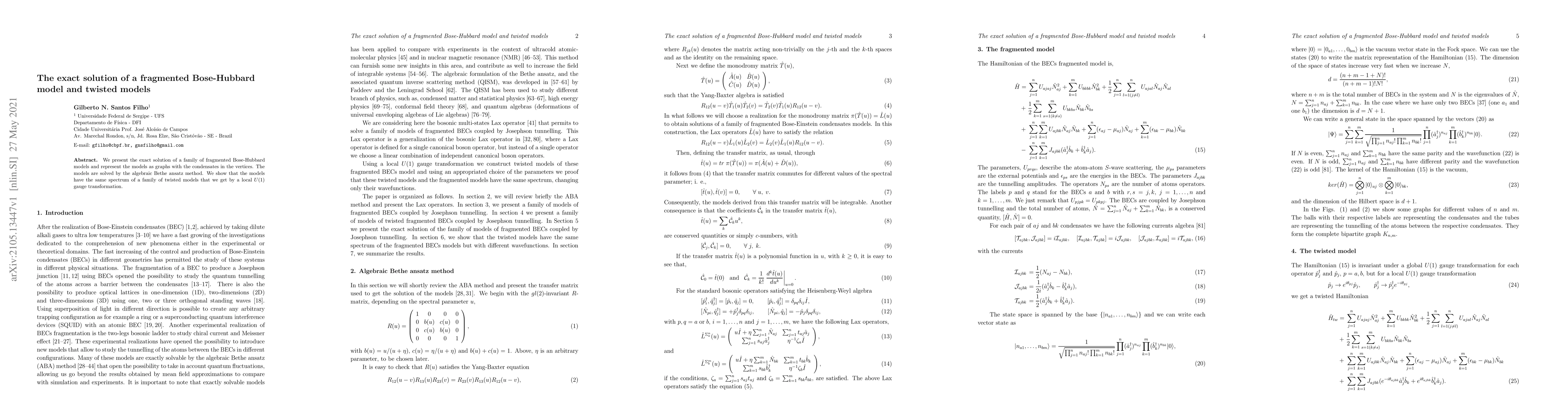 The paper presents the exact solution of fragmented Bose-Hubbard models using the algebraic Bethe ansatz method, showing they share the same spectrum as twisted models obtained via a local U(1) gauge transformation. The models are represented as graphs with condensates at vertices.