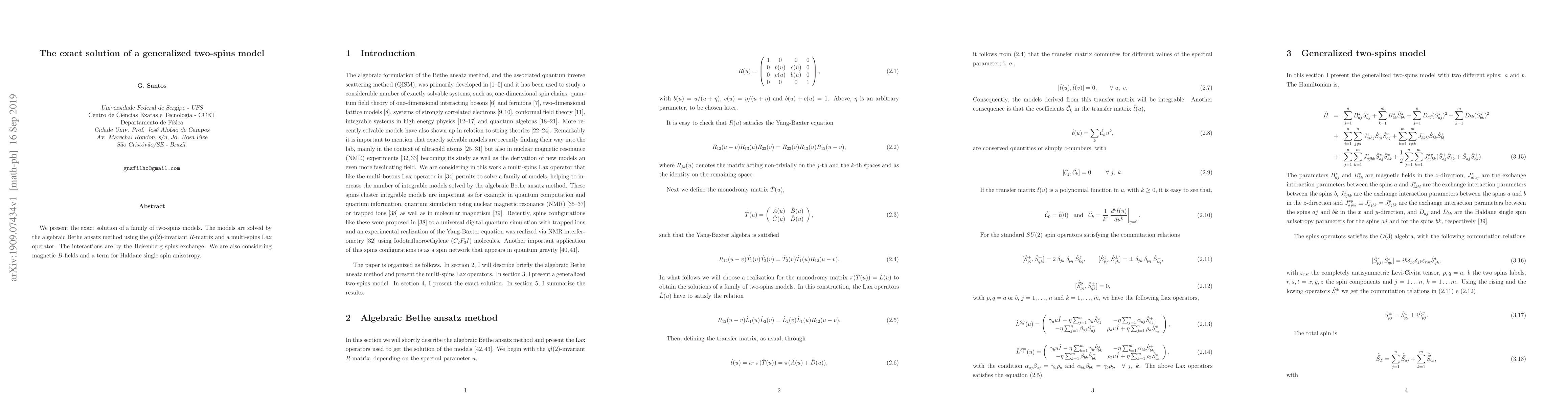 We present the exact solution of a family of two-spins models. The models are solved by the algebraic Bethe ansatz method using the $gl(2)$-invariant $R$-matrix and a multi-spins Lax operator. The interactions are by the Heisenberg spins exchange. We are also considering magnetic $B$-fields and a term for Haldane single spin anisotropy.