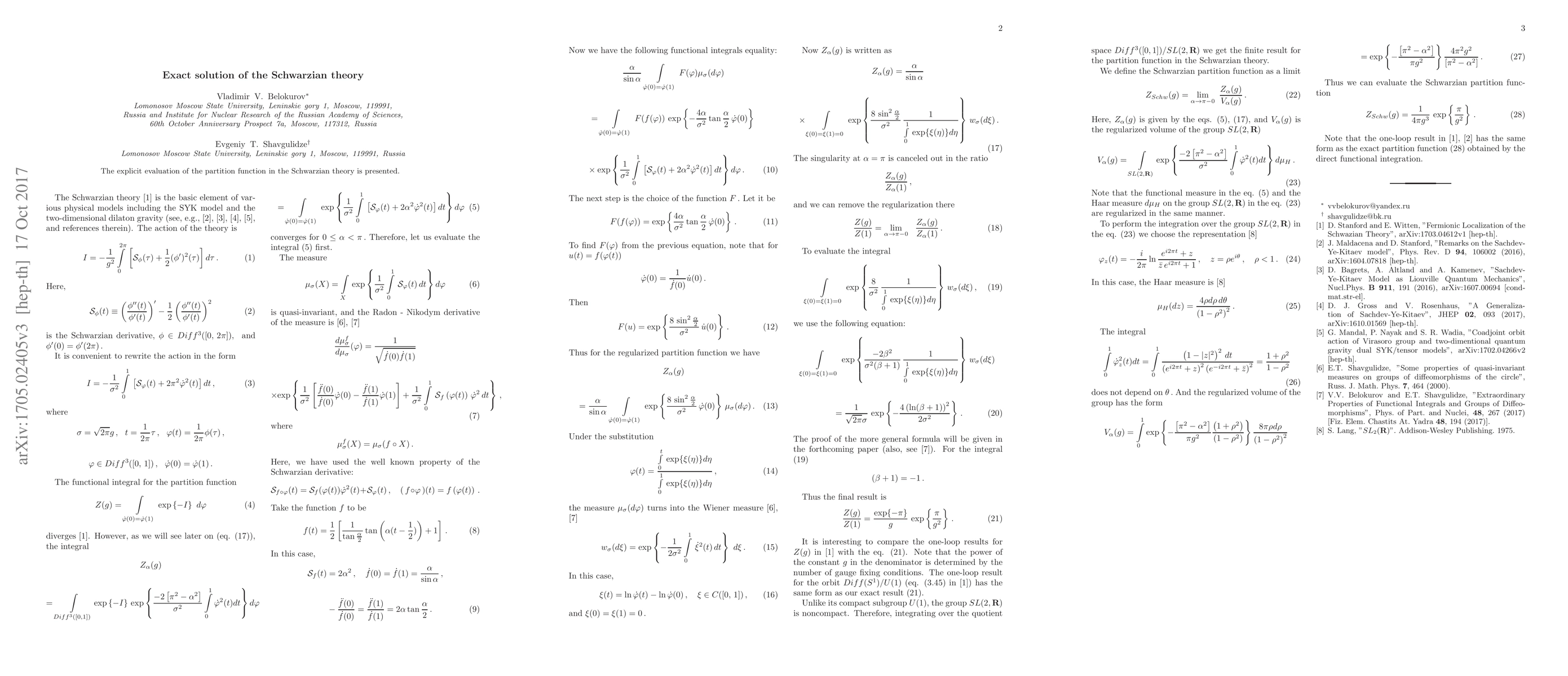 Summary: This paper provides an exact solution for the partition function in the Schwarzian theory, offering a comprehensive evaluation of its fundamental aspects. The findings contribute significantly to the understanding of this theoretical framework.