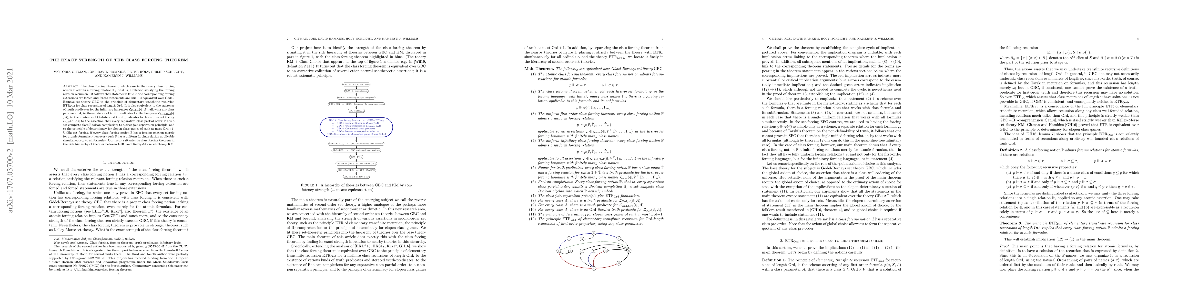 The class forcing theorem is equivalent to several foundational principles in set theory, including elementary transfinite recursion, existence of truth predicates, and determinacy for class games. It situates itself within the hierarchy between Gödel-Bernays set theory and Kelley-Morse set theory.