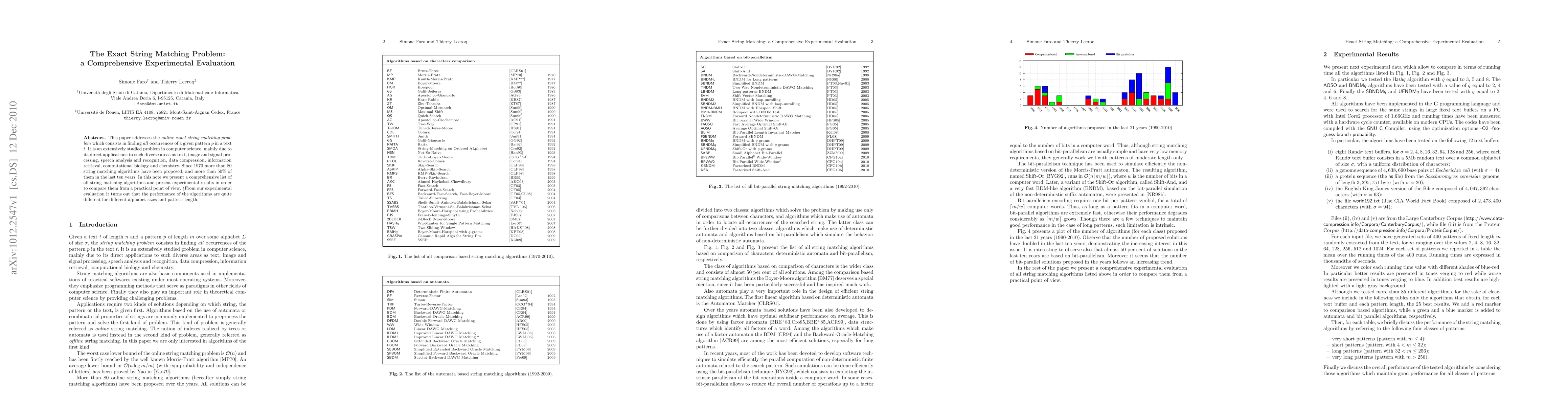 This paper evaluates various string matching algorithms for finding pattern occurrences in text, highlighting their performance differences based on alphabet sizes and pattern length. Experimental results reveal significant variations in algorithm efficiency across different conditions.