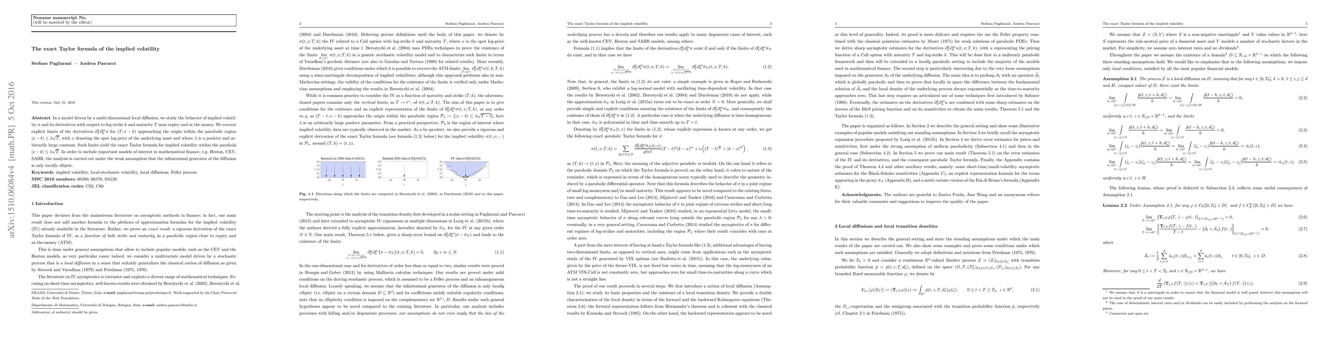 In a model driven by a multi-dimensional local diffusion, we study the behavior of implied volatility {\sigma} and its derivatives with respect to log-strike k and maturity T near expiry and at the money. We recover explicit limits of these derivatives for (T,k) approaching the origin within the parabolic region |x-k|^2 < {\lambda} T, with x denoting the spot log-price of the underlying asset and where {\lambda} is a positive and arbitrarily large constant. Such limits yield the exact Taylor formula for implied volatility within the parabola |x-k|^2 < {\lambda} T. In order to include important models of interest in mathematical finance, e.g. Heston, CEV, SABR, the analysis is carried out under the assumption that the infinitesimal generator of the diffusion is only locally elliptic.