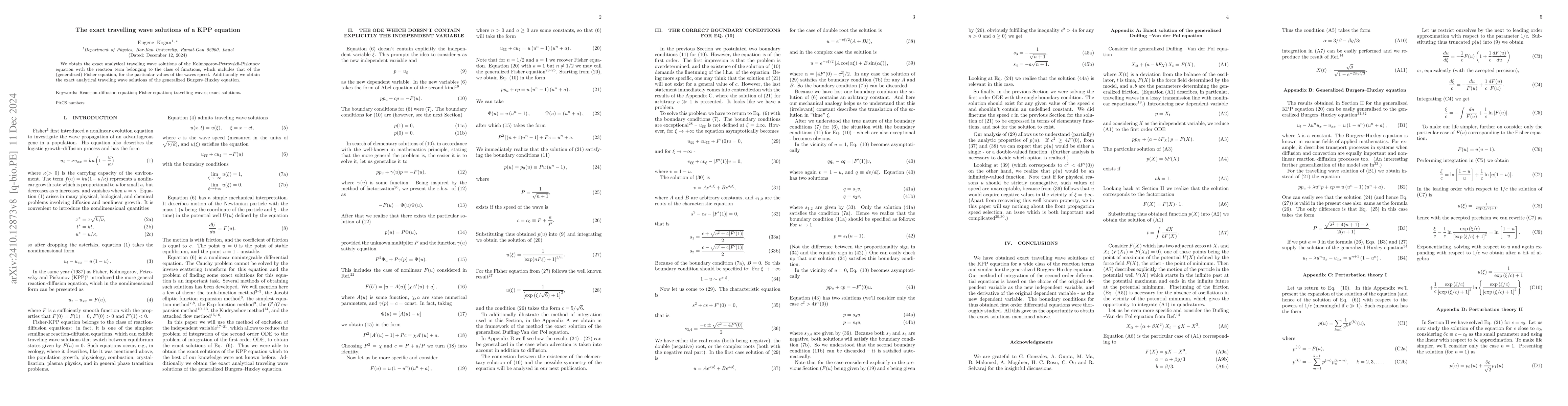 This paper presents exact analytical traveling wave solutions for the KPP equation and the generalized Burgers-Huxley equation for specific wave speeds, utilizing methods that apply to the generalized Fisher equation. The solutions provide insights into the dynamics of reaction-diffusion systems.