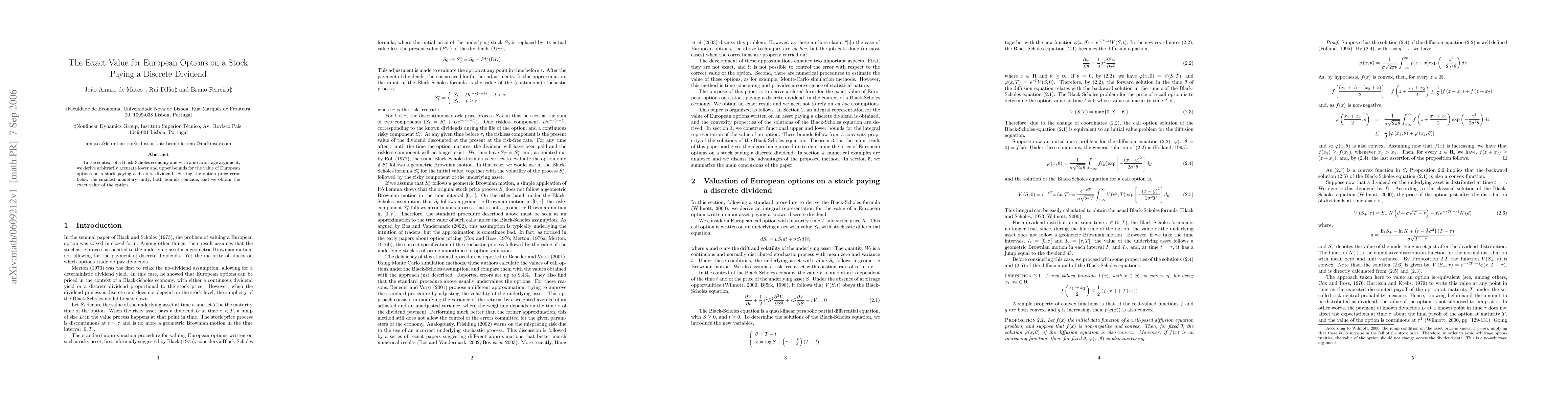 In the context of a Black-Scholes economy and with a no-arbitrage argument, we derive arbitrarily accurate lower and upper bounds for the value of European options on a stock paying a discrete dividend. Setting the option price error below the smallest monetary unity, both bounds coincide, and we obtain the exact value of the option.