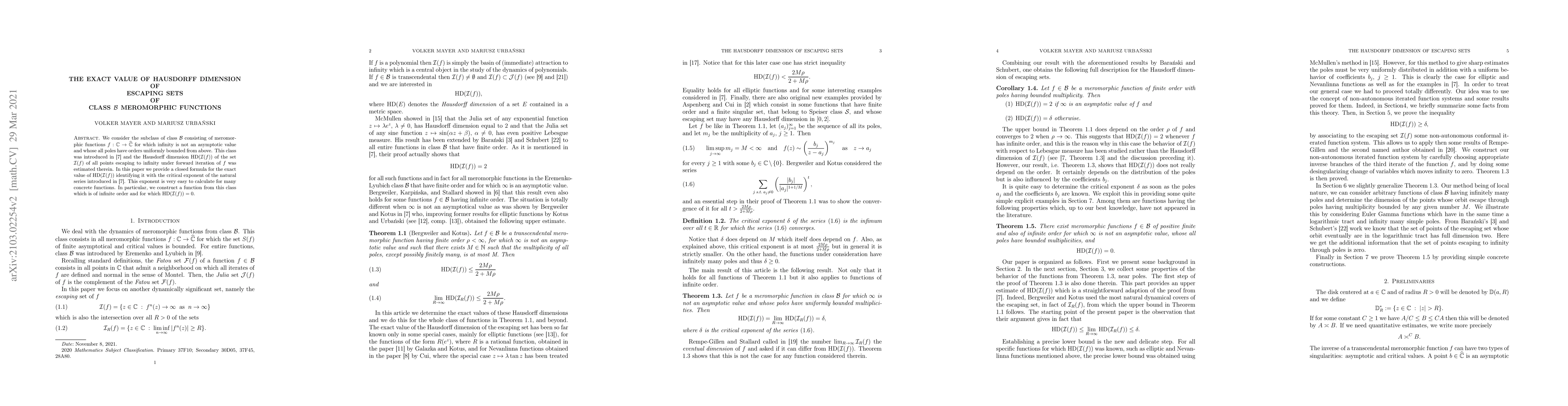 This paper determines the exact Hausdorff dimension of the escaping set for a subclass of class B meromorphic functions, providing a closed formula linked to the critical exponent of a natural series. It also constructs a specific function of infinite order with a zero Hausdorff dimension for its escaping set.
