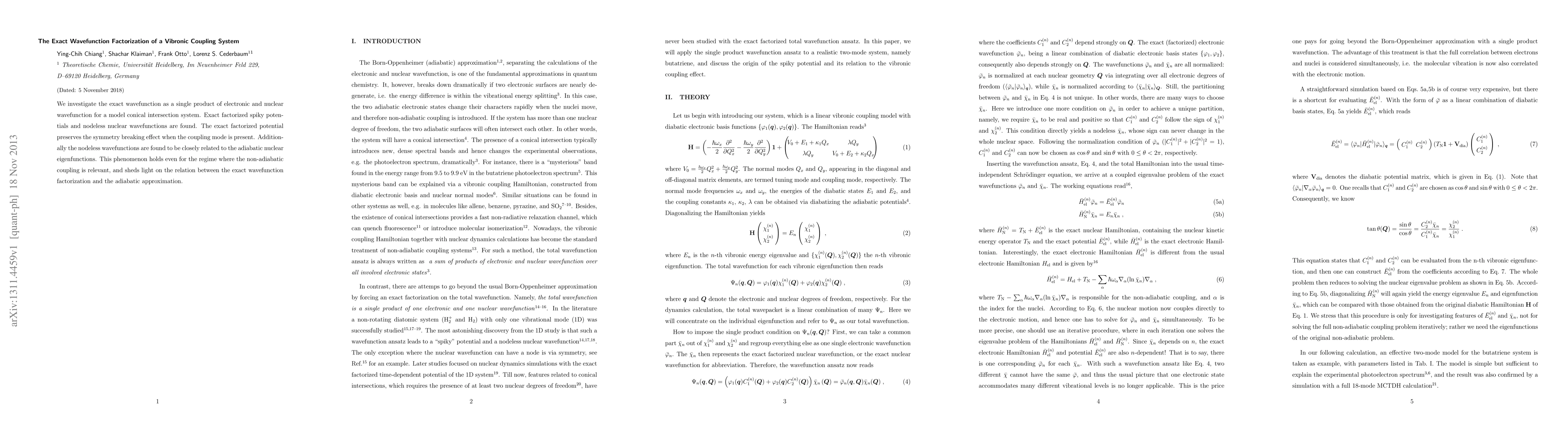 This paper explores the exact factorization of the wavefunction into electronic and nuclear components in a vibronic coupling system, revealing spiky potentials and nodeless nuclear wavefunctions that maintain symmetry breaking effects. The nodeless wavefunctions correlate closely with adiabatic nuclear eigenfunctions, even in regimes with significant non-adiabatic coupling, highlighting the connection between exact factorization and the adiabatic approximation.