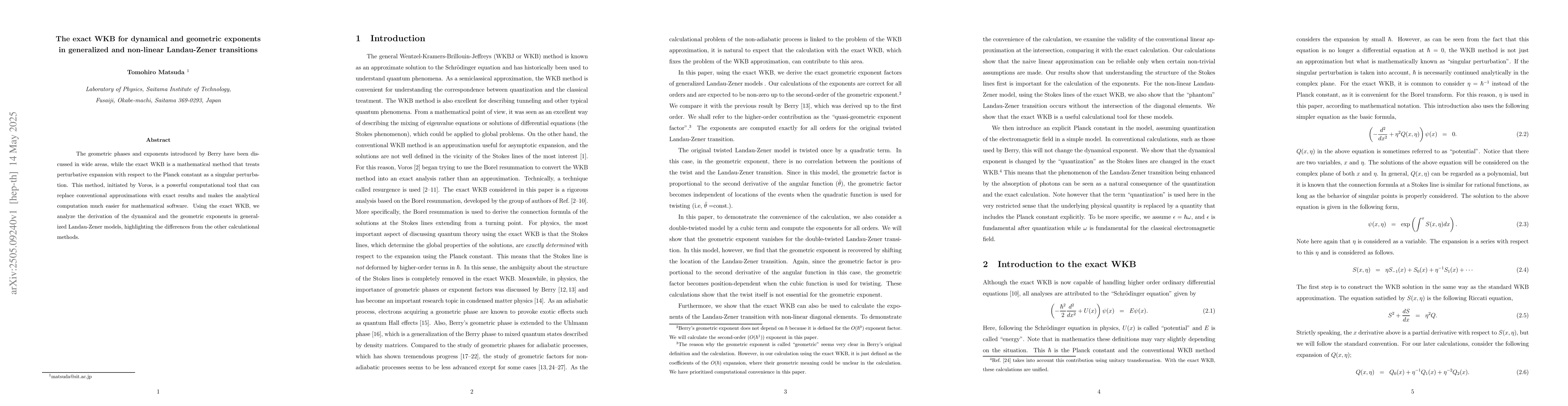 The introduction and application of the exact WKB method to derive dynamical and geometric exponents in generalized Landau-Zener transitions, offering exact computational results.
