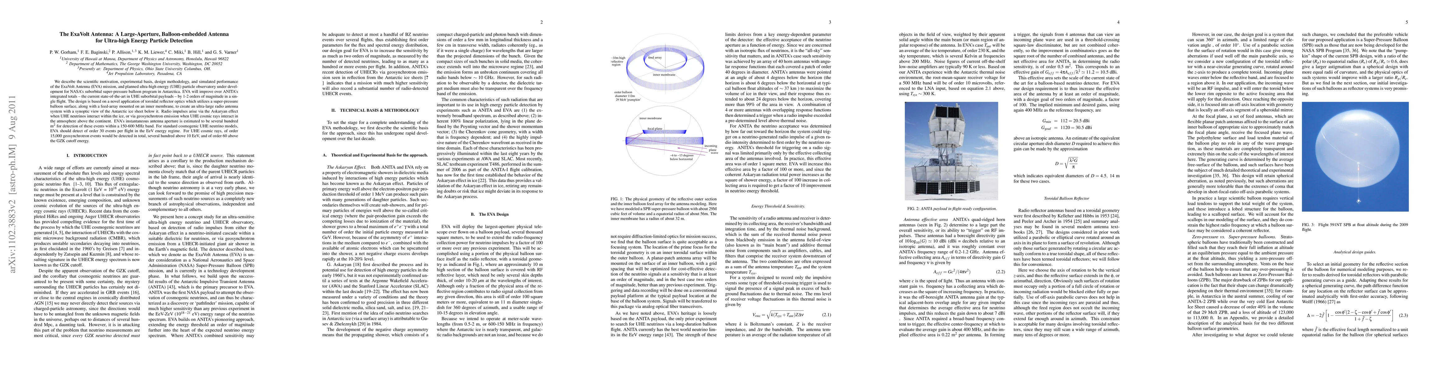 We describe the scientific motivation, experimental basis, design methodology, and simulated performance of the ExaVolt Antenna (EVA) mission, and planned ultra-high energy (UHE) particle observatory under development for NASA's suborbital super-pressure balloon program in Antarctica. EVA will improve over ANITA's integrated totals - the current state-of-the-art in UHE suborbital payloads - by 1-2 orders of magnitude in a single flight. The design is based on a novel application of toroidal reflector optics which utilizes a super-pressure balloon surface, along with a feed-array mounted on an inner membrane, to create an ultra-large radio antenna system with a synoptic view of the Antarctic ice sheet below it. Radio impulses arise via the Askaryan effect when UHE neutrinos interact within the ice, or via geosynchrotron emission when UHE cosmic rays interact in the atmosphere above the continent. EVA's instantaneous antenna aperture is estimated to be several hundred square meters for detection of these events within a 150-600 MHz band. For standard cosmogenic UHE neutrino models, EVA should detect of order 30 events per flight in the EeV energy regime. For UHE cosmic rays, of order 15,000 geosynchrotron events would be detected in total, several hundred above 10 EeV, and of order 60 above the GZK cutoff energy