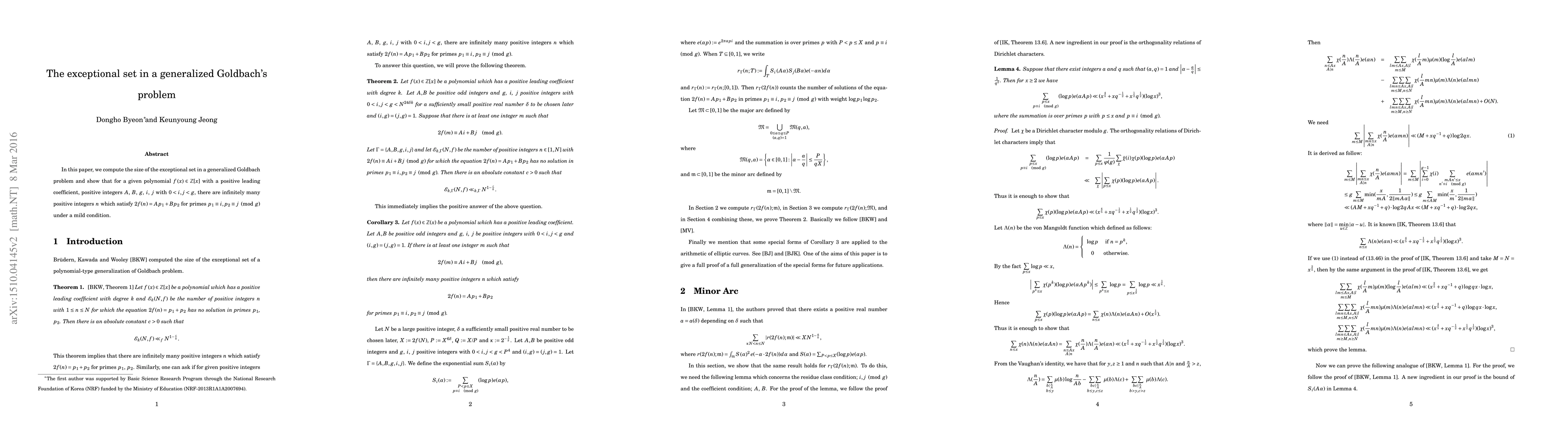 In this paper, we compute the size of the exceptional set in a generalized Goldbach problem and show that for a given polynomial $f(x) \in \mathbb{Z}[x]$ with a positive leading coefficient, positive integers $A$, $B$, $g$ and $0 \leq i, j < g$, there are infinitely many integers $n$ which satisfy $f(n) = Ap + Bq$ for some primes $p \equiv i, q \equiv j \pmod{g}$ under a mild condition.