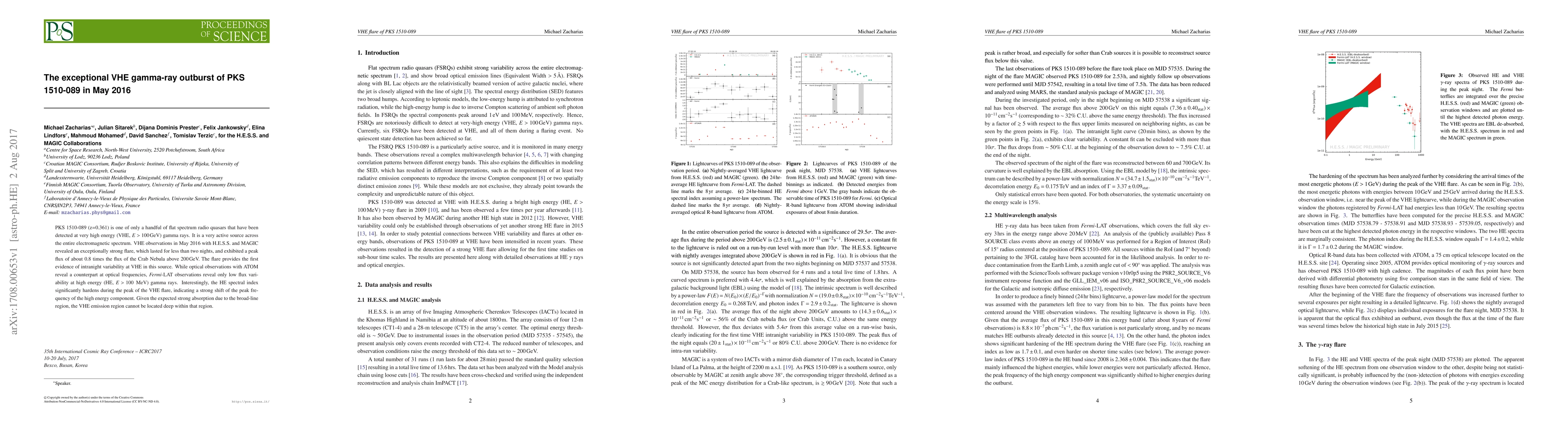 Researchers observed a strong gamma-ray flare from PKS 1510-089, a flat-spectrum radio quasar, in May 2016, providing the first evidence of intranight variability at Very High Energy (VHE) gamma rays.