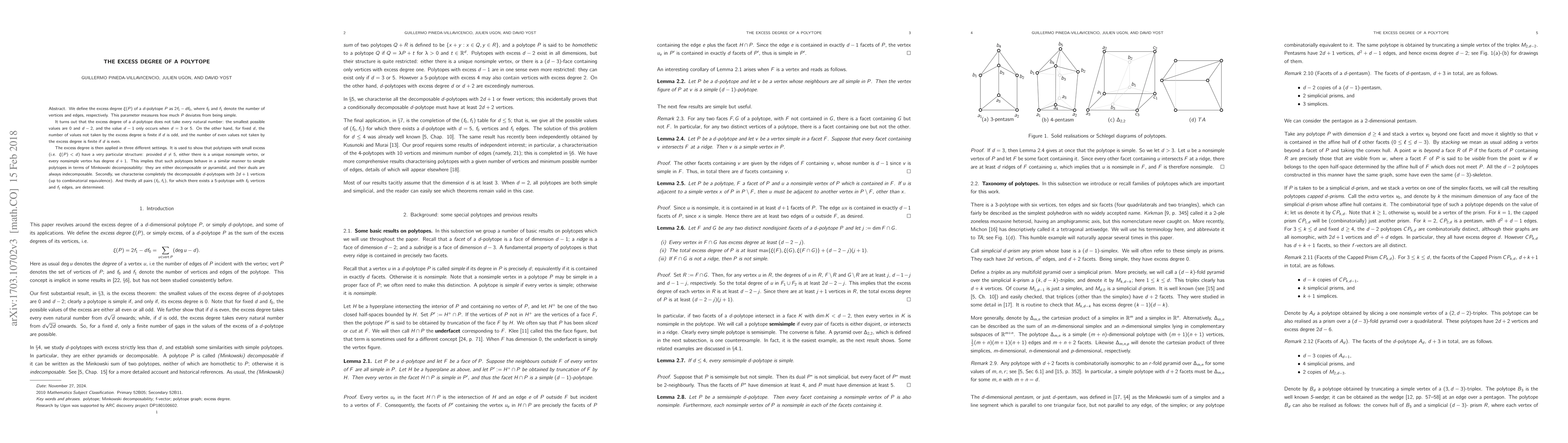 The excess degree $\xi(P)$ of a $d$-polytope $P$ measures its deviation from simplicity, defined as $2f_1-df_0$. It reveals that certain values are unattainable, with specific exceptions for $d=3$ or $5$. The parameter is used to characterize the structure of polytopes with small excess, revealing unique or pyramidal properties, and to determine specific vertex and edge configurations for $d$-polytopes.
