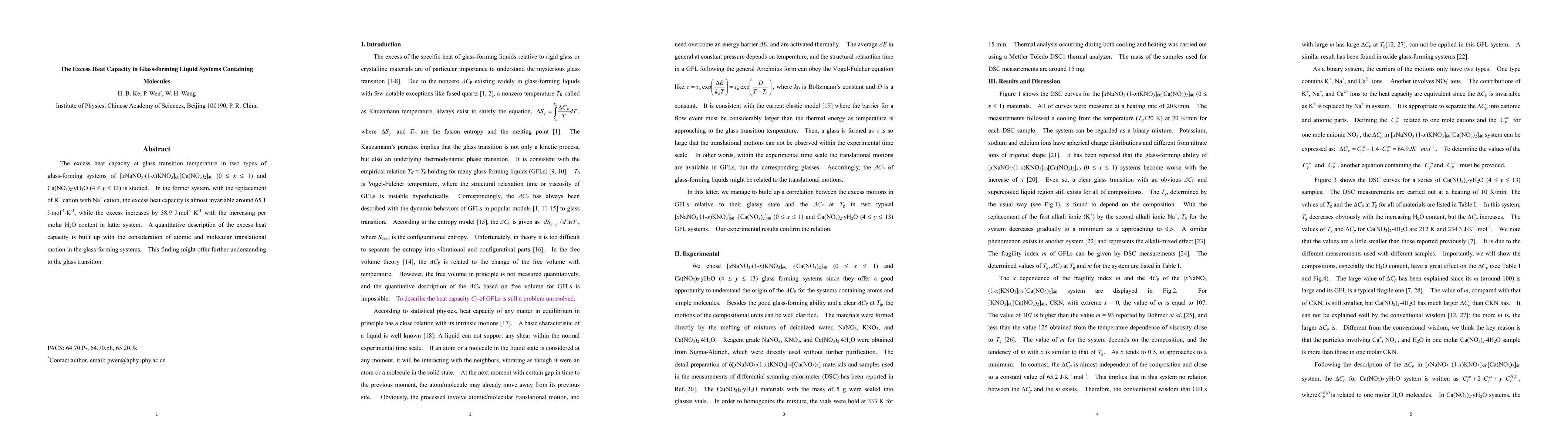 This study investigates the excess heat capacity at the glass transition temperature in two glass-forming systems, finding that it remains nearly constant in the first system with varying Na+ and K+ cations, but increases significantly in the second system with increasing water content. The findings provide insights into the atomic and molecular dynamics influencing the glass transition.