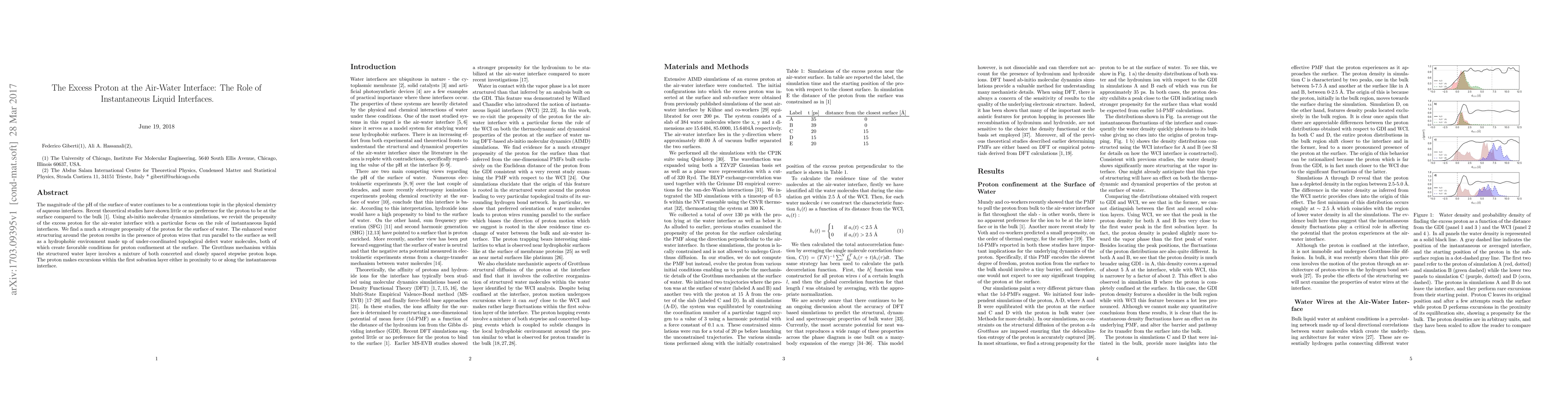 This paper uses ab-initio molecular dynamics simulations to demonstrate a stronger tendency for excess protons to reside at the air-water interface, facilitated by structured water and proton wires, and involving both concerted and stepwise proton hops via the Grotthuss mechanism.