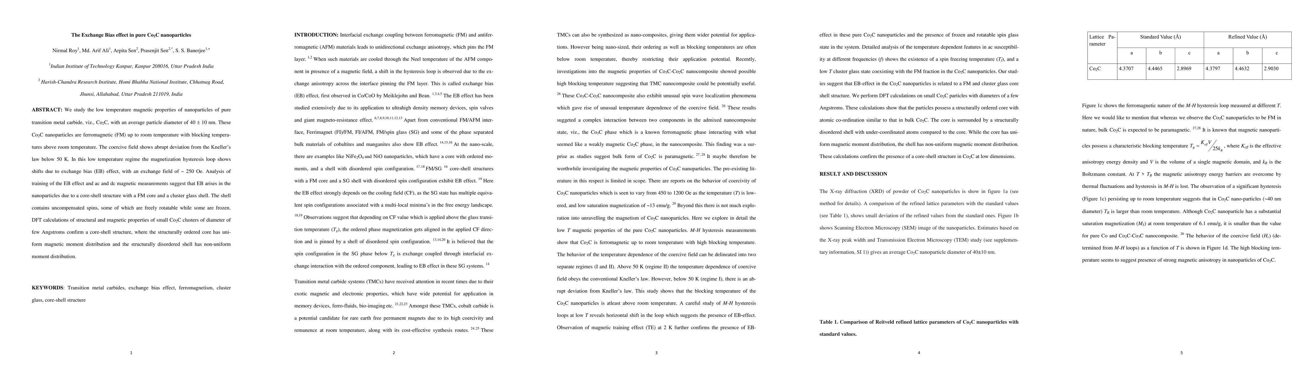 We study the low temperature magnetic properties of nanoparticles of pure transition metal carbide, viz., Co2C, with an average particle diameter of $40 \pm 10$ nm. These Co2C nanoparticles are ferromagnetic (FM) up to room temperature with blocking temperatures above room temperature. The coercive field shows abrupt deviation from the Kneller law below 50 K. In this low temperature regime the magnetization hysteresis loop shows shifts due to exchange bias (EB) effect, with an exchange field of ~ 250 Oe. Analysis of training of the EB effect and ac and dc magnetic measurements suggest that EB arises in the nanoparticles due to a core-shell structure with a FM core and a cluster glass shell. The shell contains uncompensated spins, some of which are freely rotatable while some are frozen. DFT calculations of structural and magnetic properties of small Co2C clusters of diameter of few Angstroms confirm a core-shell structure, where the structurally ordered core has uniform magnetic moment distribution and the structurally disordered shell has non-uniform moment distribution.