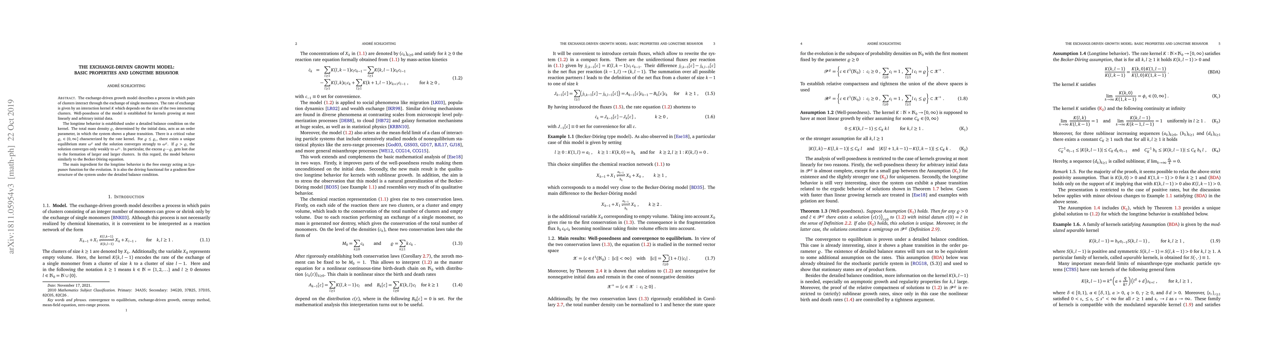 The exchange-driven growth model predicts a phase transition at a critical value of order parameter $ ho_c$, with unique strong convergence to equilibrium for $ ho elow ho_c$ and weak convergence otherwise.