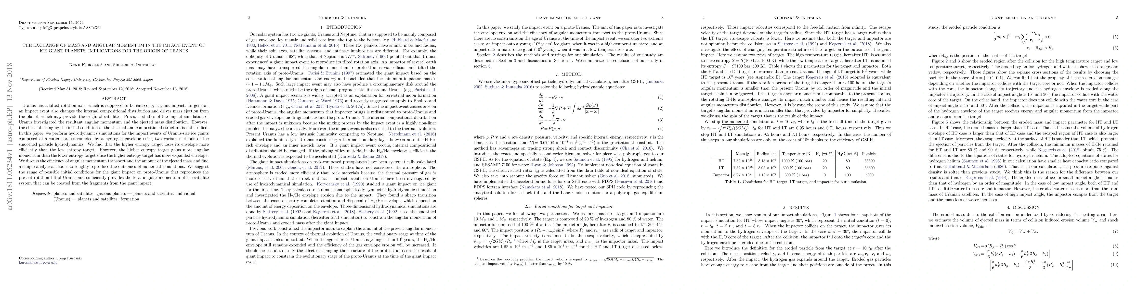 Uranus has a tilted rotation axis, which is supposed to be caused by a giant impact. In general, an impact event also changes the internal compositional distribution and drives mass ejection from the planet, which may provide the origin of satellites. Previous studies of the impact simulation of Uranus investigated the resultant angular momentum and the ejected mass distribution. However, the effect of changing the initial condition of the thermal and compositional structure is not studied. In this paper, we perform hydrodynamics simulations for the impact events of Uranus-size ice giants composed of a water core surrounded by a hydrogen envelope using two variant methods of the smoothed particle hydrodynamics. We find that the higher entropy target loses its envelope more efficiently than the low entropy target. However, the higher entropy target gains more angular momentum than the lower entropy target since the higher entropy target has more expanded envelope. We discuss the efficiency of angular momentum transport and the amount of the ejected mass and find a simple analytical model to roughly reproduce the outcomes of numerical simulations. We suggest the range of possible initial conditions for the giant impact on proto-Uranus that reproduces the present rotation tilt of Uranus and sufficiently provides the total angular momentum of the satellite system that can be created from the fragments from the giant impact.