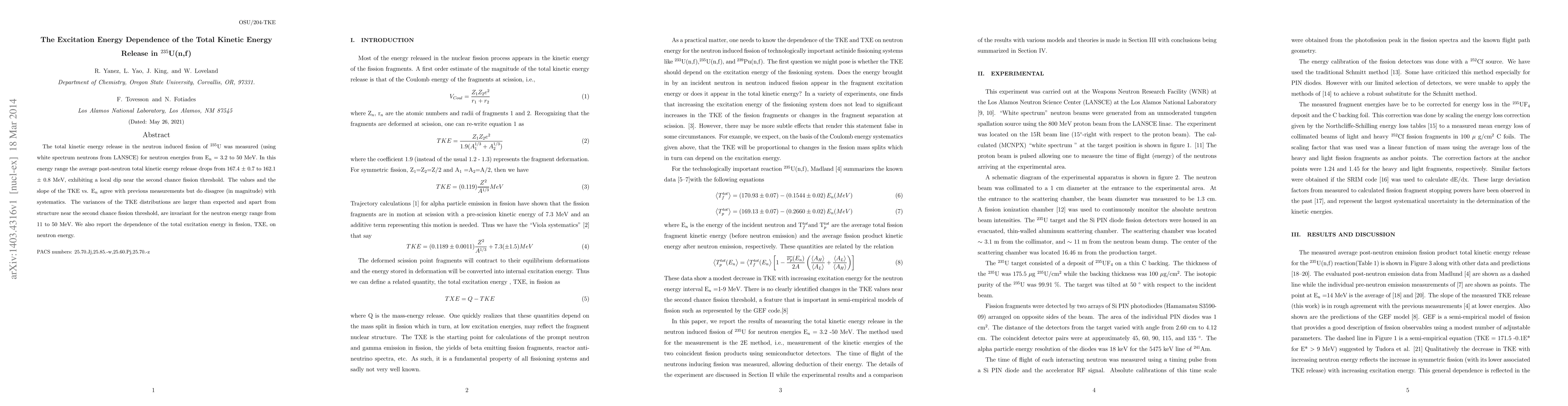 The total kinetic energy release in the neutron induced fission of $^{235}$U was measured (using white spectrum neutrons from LANSCE) for neutron energies from E$_{n}$ = 3.2 to 50 MeV. In this energy range the average post-neutron total kinetic energy release drops from 167.4 $\pm$ 0.7 to 162.1 $\pm$ 0.8 MeV, exhibiting a local dip near the second chance fission threshold. The values and the slope of the TKE vs. E$_{n}$ agree with previous measurements but do disagree (in magnitude) with systematics. The variances of the TKE distributions are larger than expected and apart from structure near the second chance fission threshold, are invariant for the neutron energy range from 11 to 50 MeV. We also report the dependence of the total excitation energy in fission, TXE, on neutron energy.
