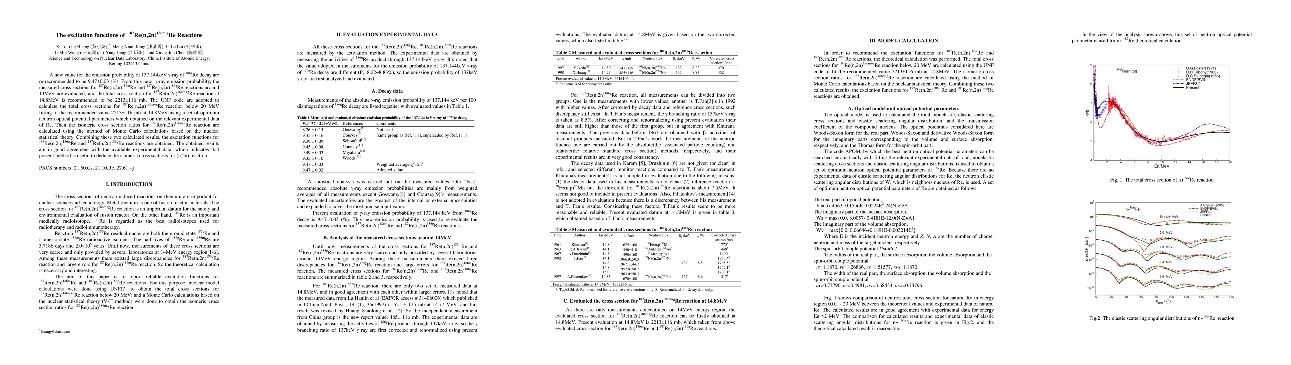 A new value for the emission probability of 137.144keV g-ray of 186gRe decay are re-recommended to be 9.47+-0.03 (%). From this new g-ray emission probability, the measured cross sections for 187Re(n,2n)186mRe and 187Re(n,2n)186gRe reactions around 14MeV are evaluated, and the total cross section for 187Re(n,2n)186m+gRe reaction at 14.8MeV is recommended to be 2213+-116 mb. The UNF code are adopted to calculate the total cross sections for 187Re(n,2n)186m+gRe reaction below 20 MeV fitting to the recommended value 2213+-116 mb at 14.8MeV using a set of optimum neutron optical potential parameters which obtained on the relevant experimental data of Re. Then the isomeric cross section ratios for 187Re(n,2n)186m,gRe reaction are calculated using the method of Monte Carlo calculations based on the nuclear statistical theory. Combining these two calculated results, the excitation functions for 187Re(n,2n)186mRe and 187Re(n,2n)186gRe reactions are obtained. The obtained results are in good agreement with the available experimental data, which indicates that present method is useful to deduce the isomeric cross sections for (n,2n) reaction.