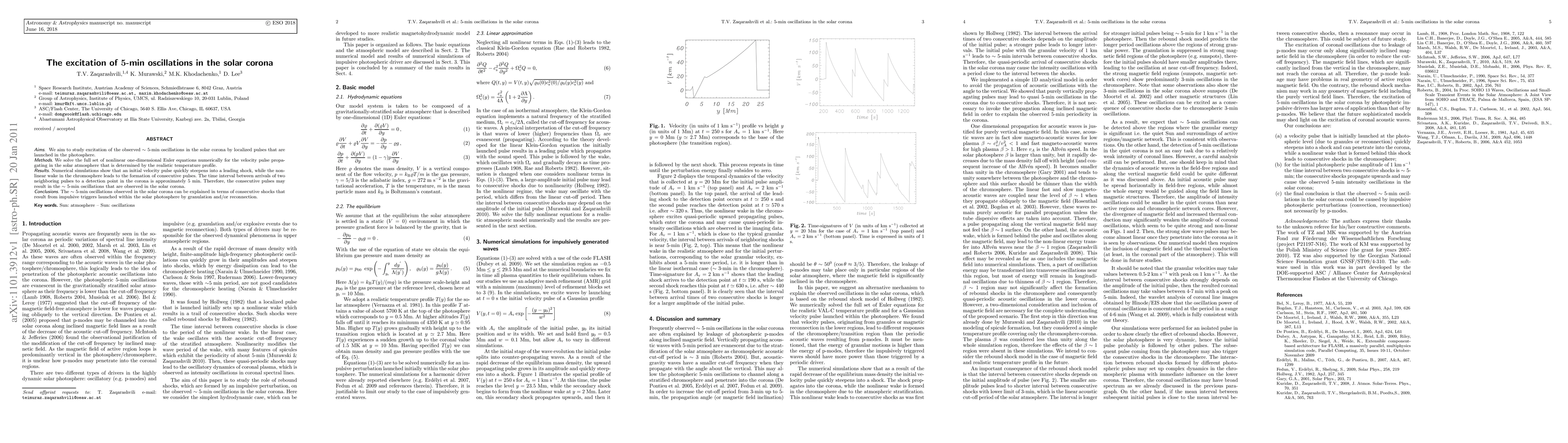 We aim to study excitation of the observed 5-min oscillations in the solar corona by localized pulses that are launched in the photosphere. We solve the full set of nonlinear one-dimensional Euler equations numerically for the velocity pulse propagating in the solar atmosphere that is determined by the realistic temperature profile. Numerical simulations show that an initial velocity pulse quickly steepens into a leading shock, while the nonlinear wake in the chromosphere leads to the formation of consecutive pulses. The time interval between arrivals of two neighboring pulses to a detection point in the corona is approximately 5 min. Therefore, the consecutive pulses may result in the 5-min oscillations that are observed in the solar corona. The 5-min oscillations observed in the solar corona can be explained in terms of consecutive shocks that result from impulsive triggers launched within the solar photosphere by granulation and/or reconnection.