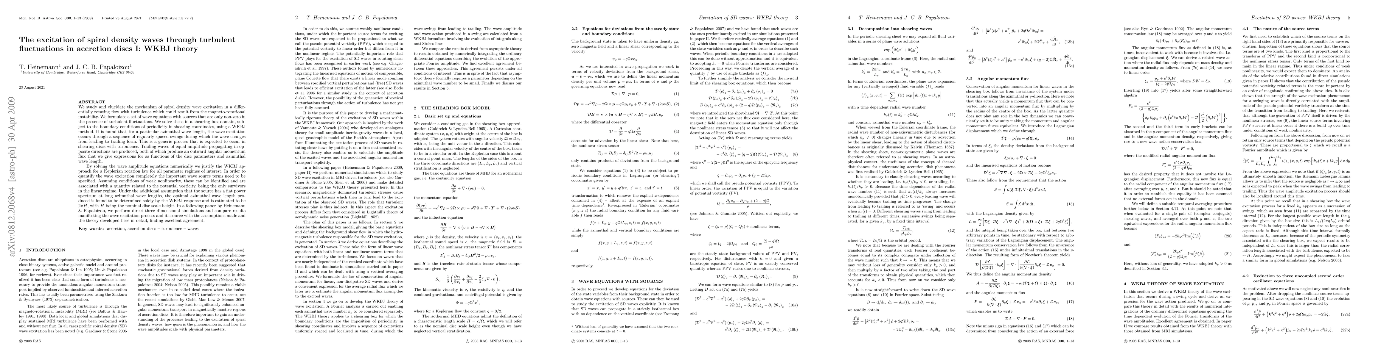 We study and elucidate the mechanism of spiral density wave excitation in a differentially rotating turbulent flow. We formulate a set of wave equations with sources that are only non-zero in the presence of turbulent fluctuations. We solve these in a shearing box domain using a WKBJ method. It is found that, for a particular azimuthal wave length, the wave excitation occurs through a sequence of regularly spaced swings during which the wave changes from leading to trailing form. This is a generic process that is expected to occur in shearing discs with turbulence. Trailing waves of equal amplitude propagating in opposite directions are produced, both of which produce an outward angular momentum flux that we give expressions for as functions of the disc parameters and azimuthal wave length. By solving the wave amplitude equations numerically we justify the WKBJ approach for a Keplerian rotation law for all parameter regimes of interest. In order to quantify the wave excitation completely the important wave source terms need to be specified. Assuming conditions of weak nonlinearity, these can be identified and are associated with a quantity related to the potential vorticity, being the only survivors in the linear regime. Under the additional assumption that the source has a flat power spectrum at long azimuthal wave lengths, the optimal azimuthal wave length produced is found to be determined solely by the WKBJ response and is estimated to be 2 pi H, with H being the nominal disc scale height.