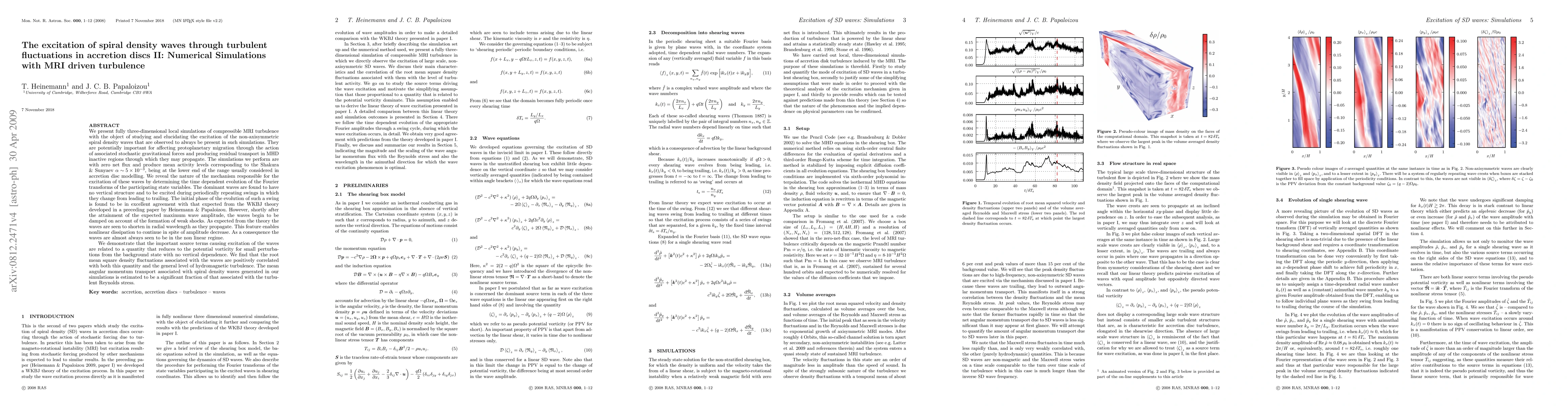 We present fully three-dimensional local MRI simulations with the object of studying the excitation of non-axisymmetric spiral density waves that are observed to always be present in such simulations. They are potentially important for affecting protoplanetary migration through the action of associated stochastic gravitational forces and producing residual transport in MHD inactive regions. The simulations we perform are with zero net flux and produce mean activity levels of alpha ~ 0.005. We reveal the nature of the mechanism responsible for the excitation of these waves by determining the time dependent evolution of the Fourier transforms of the participating state variables. The dominant waves are found to have no vertical structure and to be excited during periodically repeating swings in which they change from leading to trailing. The initial phase of the evolution of such a swing is found to be in excellent agreement with that expected from the WKBJ theory developed in a preceding paper by Heinemann & Papaloizou. We demonstrate that the important source terms causing excitation of the waves are related to a quantity that reduces to the potential vorticity for small perturbations from the background state with no vertical dependence. We find that the root mean square density fluctuations associated with the waves are positively correlated with both this quantity and the general level of hydromagnetic turbulence. The mean angular momentum transport associated with spiral density waves generated in our simulations is estimated to be a significant fraction of that associated with the turbulent Reynolds stress.