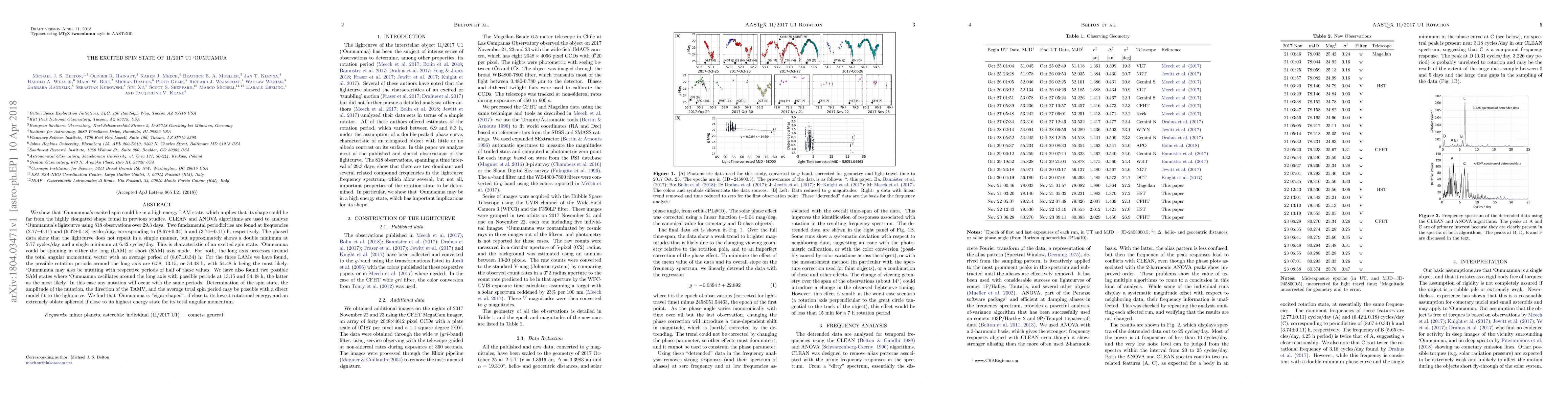 We show that `Oumuamua's excited spin could be in a high energy LAM state, which implies that its shape could be far from the highly elongated shape found in previous studies. CLEAN and ANOVA algorithms are used to analyze `Oumuamua's lightcurve using 818 observations over 29.3~days. Two fundamental periodicities are found at frequencies (2.77$\pm$0.11) and (6.42$\pm$0.18)~cycles/day, corresponding to (8.67$\pm$0.34)~h and (3.74$\pm$0.11)~h, respectively. The phased data show that the lightcurve does not repeat in a simple manner, but approximately shows a double minimum at 2.77~cycles/day and a single minimum at 6.42~cycles/day. This is characteristic of an excited spin state. `Oumuamua could be spinning in either the long (LAM) or short (SAM) axis mode. For both, the long axis precesses around the total angular momentum vector with an average period of (8.67$\pm$0.34)~h. For the three LAMs we have found, the possible rotation periods around the long axis are 6.58, 13.15, or 54.48~h, with 54.48~h being the most likely. `Oumuamua may also be nutating with respective periods of half of these values. We have also found two possible SAM states where `Oumuamua oscillates around the long axis with possible periods at 13.15 and 54.48~h, the latter as the most likely. In this case any nutation will occur with the same periods. Determination of the spin state, the amplitude of the nutation, the direction of the TAMV, and the average total spin period may be possible with a direct model fit to the lightcurve. We find that `Oumuamua is "cigar-shaped"', if close to its lowest rotational energy, and an extremely oblate spheroid if close to its highest energy state for its total angular momentum.