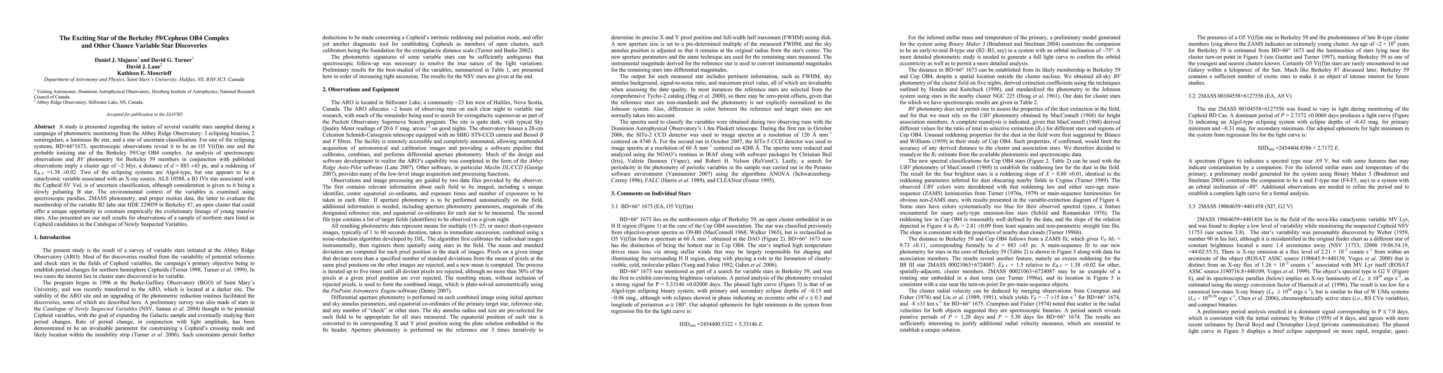 This study investigates variable stars discovered during photometric monitoring, identifying three eclipsing binaries, two semiregulars, a luminous Be star, and a star of uncertain classification. BD+66 1673 is confirmed as an O5 V((f))n star and likely the ionizing star of the Berkeley 59/Cep OB4 complex, with the cluster estimated to be ~2 Myr old, 883+-43 pc distant, and having a reddening of E(B-V) =1.38+-0.02.