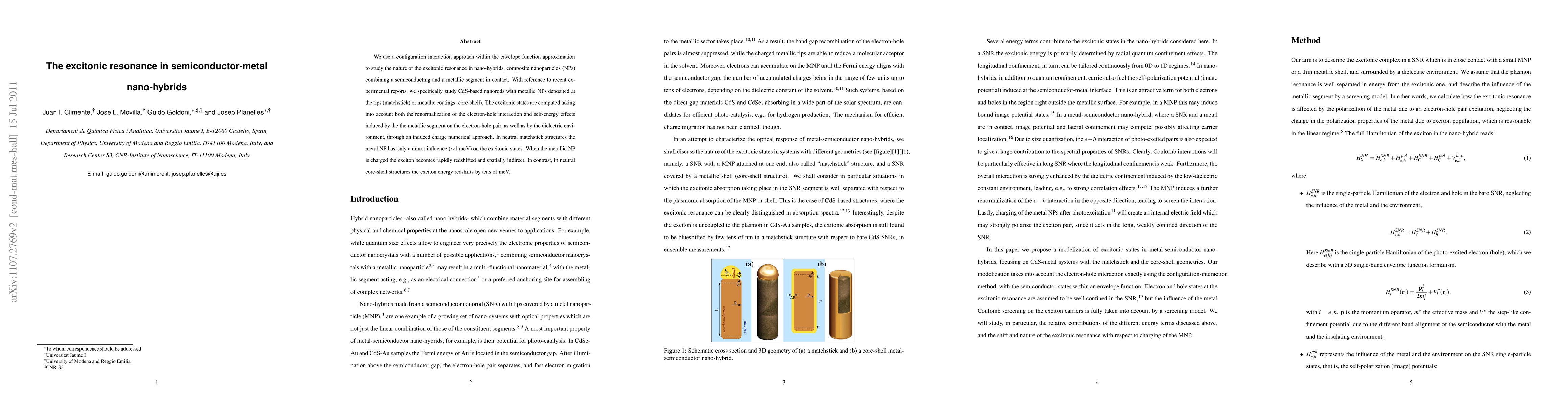 We use a configuration interaction approach within the envelope function approximation to study the nature of the excitonic resonance in nano-hybrids, composite nanoparticles (NPs) combining a semiconducting and a metallic segment in contact. With reference to recent experimental reports, we specifically study CdS-based nanorods with metallic NPs deposited at the tips (matchstick) or metallic coatings (core-shell). The excitonic states are computed taking into account both the renormalization of the electron-hole interaction and self-energy effects induced by the the metallic segment on the electron-hole pair, as well as by the dielectric environment, through an induced charge numerical approach. In neutral matchstick structures the metal NP has only a minor influence (~1 meV) on the excitonic states. When the metallic NP is charged the exciton becomes rapidly redshifted and spatially indirect. In contrast, in neutral core-shell structures the exciton energy redshifts by tens of meV