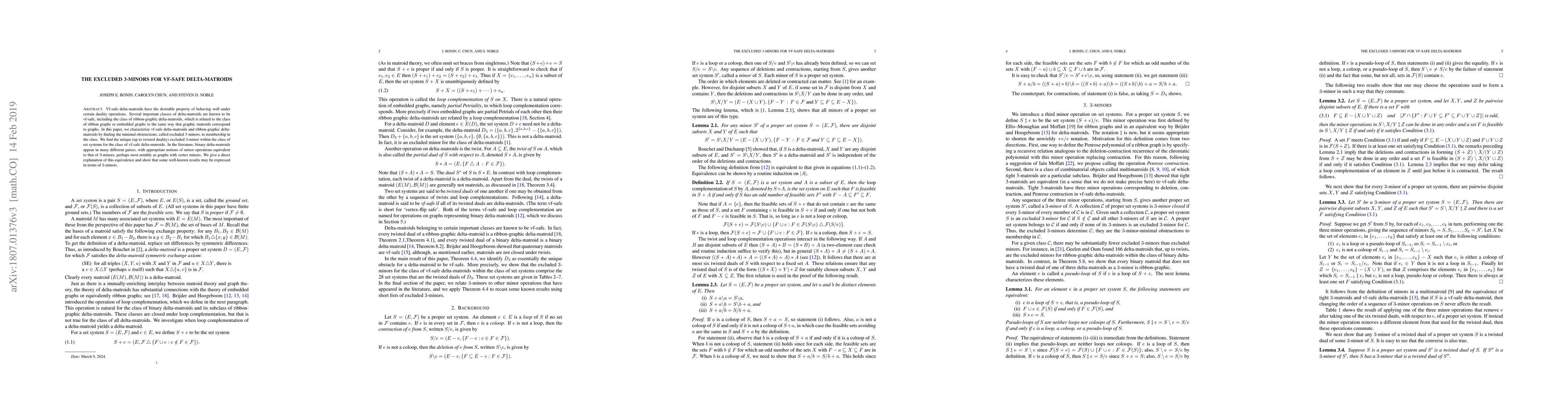 This paper identifies the unique excluded 3-minor for vf-safe delta-matroids, providing a characterization of these matroids. It also explains the equivalence of binary delta-matroids and graphs with vertex minors, allowing for the reformulation of existing results in terms of 3-minors.