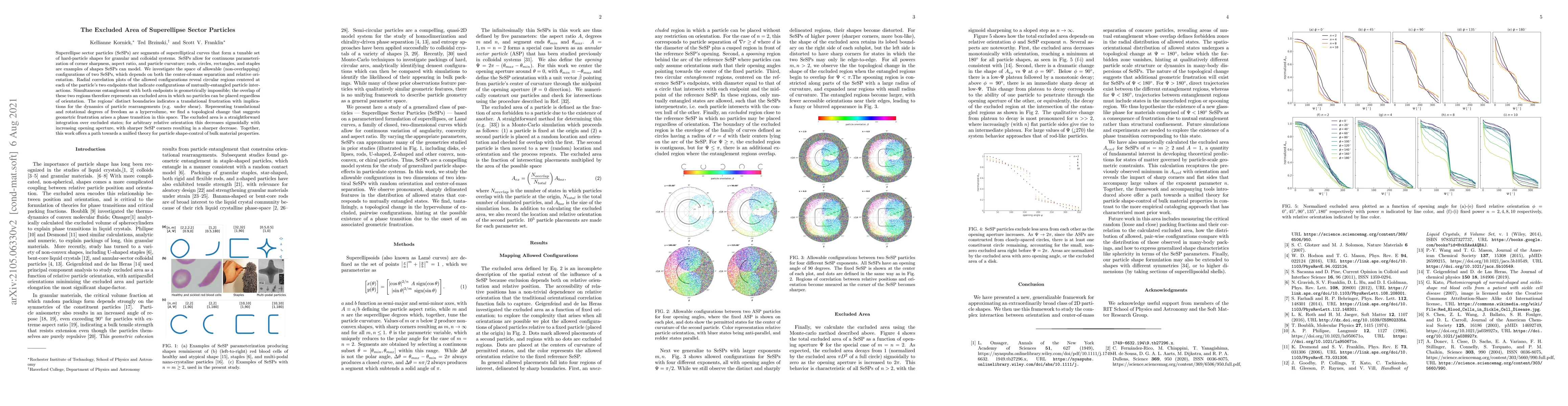 This paper explores the configurations of superellipse sector particles (SeSPs) and identifies an excluded area where particles cannot overlap regardless of orientation, leading to translational frustration. The study reveals a topological change indicating geometric frustration as a phase transition, with implications for particle dynamics under shear.