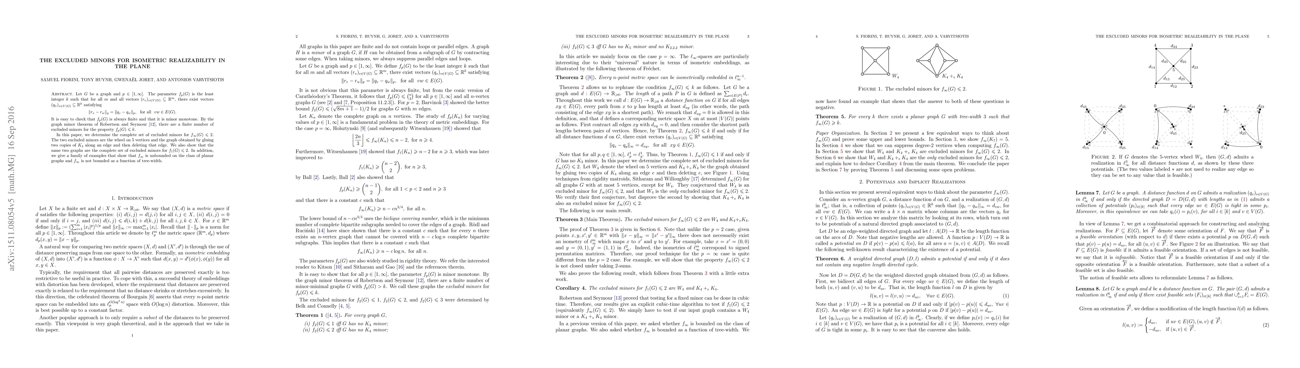 This paper identifies the complete set of excluded minors for the property that a graph's isometric realizability in the plane can be achieved with a finite dimension $k$. The two excluded minors for both $f_\infty(G) \leq 2$ and $f_1(G) \leq 2$ are the wheel on five vertices and a specific graph derived from $K_4$. It also demonstrates that $f_\infty$ is unbounded on planar graphs and not dependent on tree-width.