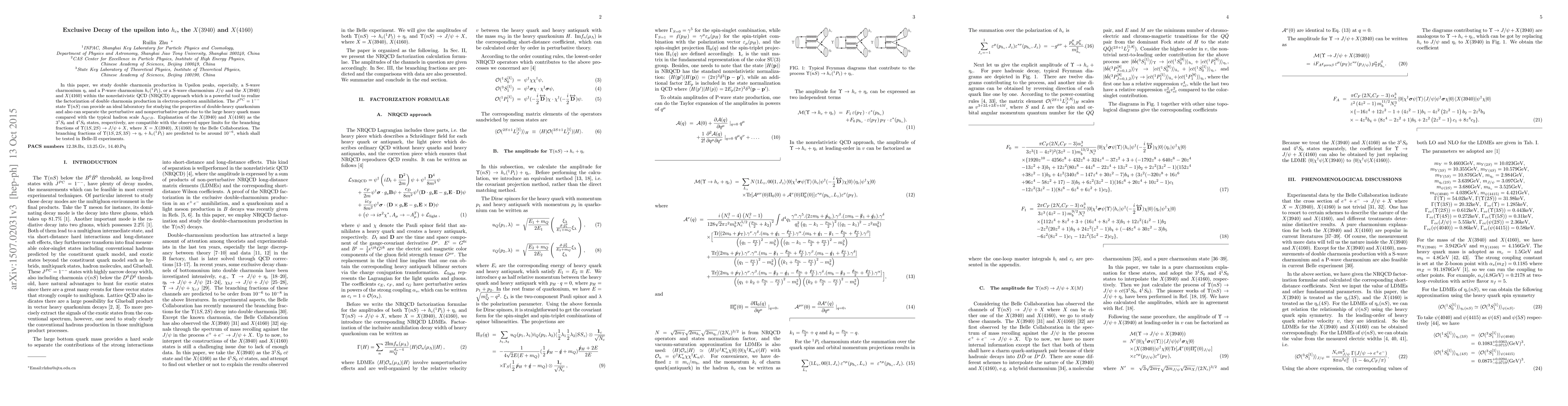 This paper investigates the exclusive decay of Upsilon into double charmonia, specifically $\eta_c$ and $h_c$, or $J/\psi$ and $X(3940)$ and $X(4160)$, using the nonrelativistic QCD approach. Predictions for branching fractions of these decays are made, with $X(3940)$ and $X(4160)$ explained as $3 ^1S_0$ and $4 ^1S_0$ states, respectively.