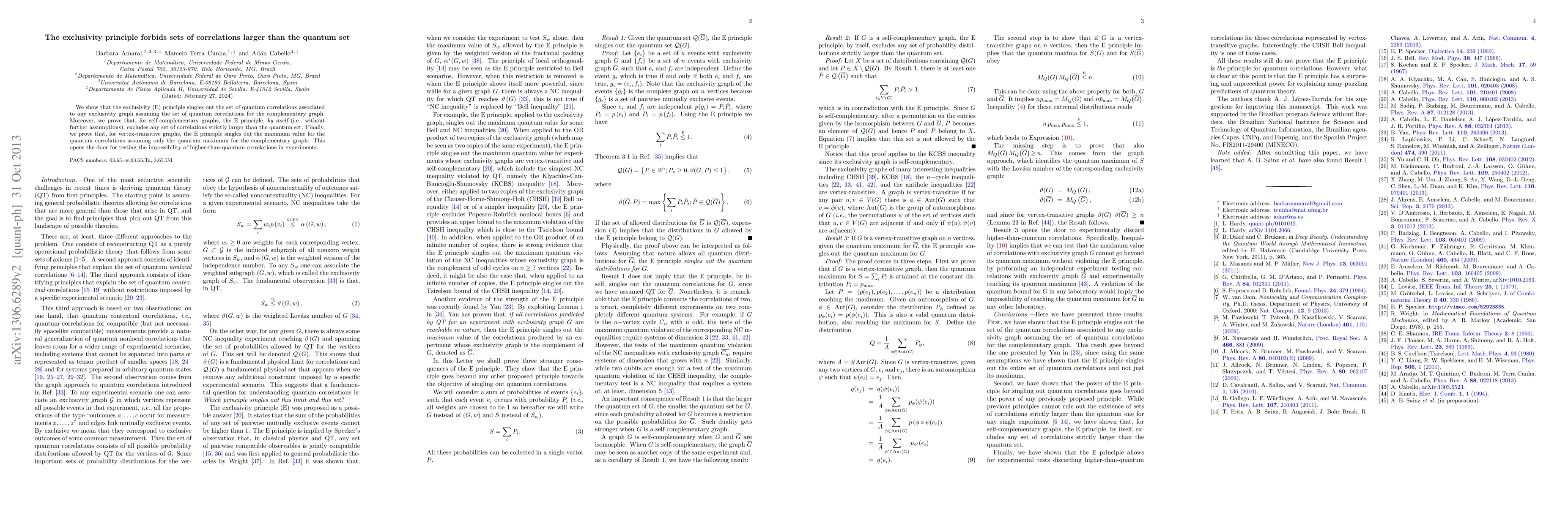 The exclusivity principle singles out quantum correlations for any exclusivity graph, and for self-complementary graphs, it prohibits any correlations larger than the quantum set. This finding suggests the potential for experimental testing of higher-than-quantum correlations.