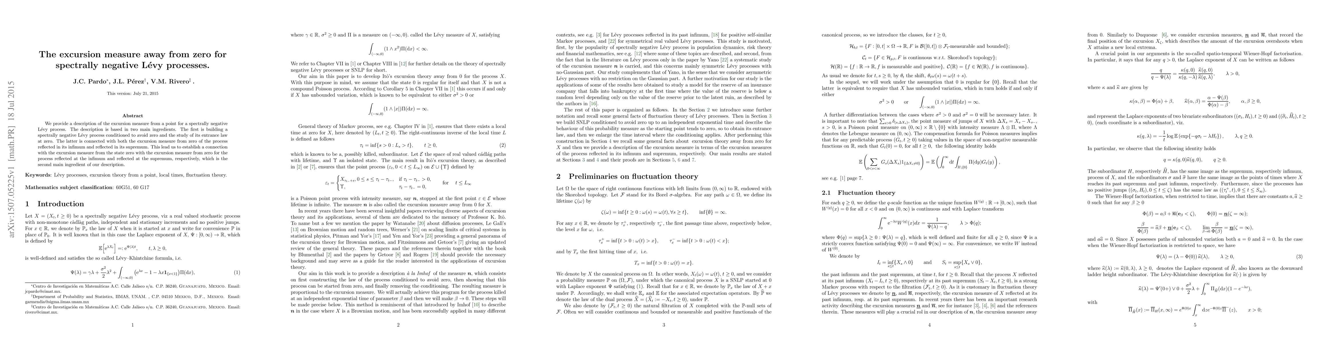 This paper describes the excursion measure from zero for a spectrally negative Lévy process, utilizing a conditioned process that avoids zero and its entrance law at zero. It establishes a connection between the original process's excursion measure and that of the reflected process at its infimum and supremum.