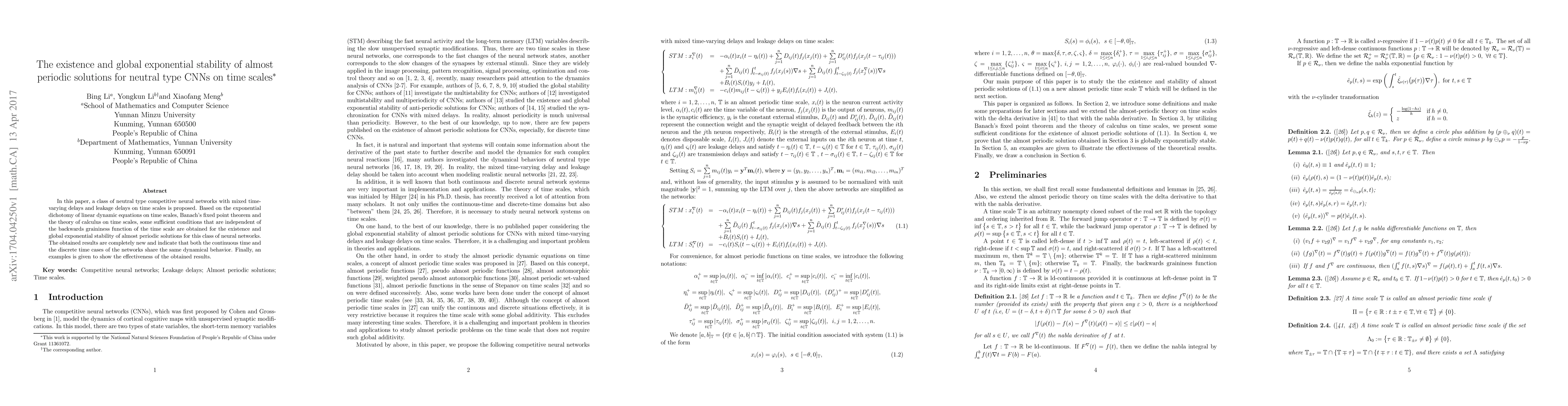 In this paper, a class of neutral type competitive neural networks with mixed time-varying delays and leakage delays on time scales is proposed. Based on the exponential dichotomy of linear dynamic equations on time scales, Banach's fixed point theorem and the theory of calculus on time scales, some sufficient conditions that are independent of the backwards graininess function of the time scale are obtained for the existence and global exponential stability of almost periodic solutions for this class of neural networks. The obtained results are completely new and indicate that both the continuous time and the discrete time cases of the networks share the same dynamical behavior. Finally, an examples is given to show the effectiveness of the obtained results.