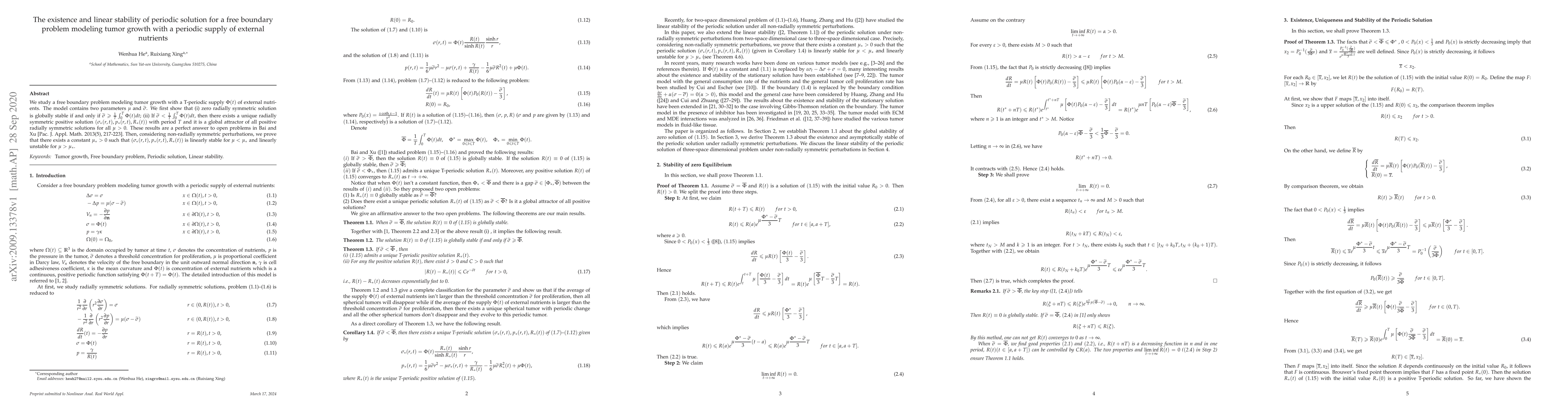 We study a free boundary problem modeling tumor growth with a T-periodic supply $\Phi(t)$ of external nutrients. The model contains two parameters $\mu$ and $\widetilde{\sigma}$. We first show that (i) zero radially symmetric solution is globally stable if and only if $\widetilde{\sigma}\ge \frac{1}{T} \int_{0}^{T} \Phi(t) d t$; (ii) If $\widetilde{\sigma}<\frac{1}{T} \int_{0}^{T} \Phi(t) d t$, then there exists a unique radially symmetric positive solution $\left(\sigma_{*}(r, t), p_{*}(r, t), R_{*}(t)\right)$ with period $T$ and it is a global attractor of all positive radially symmetric solutions for all $\mu>0$. These results are a perfect answer to open problems in Bai and Xu [Pac. J. Appl. Math. 2013(5), 217-223]. Then, considering non-radially symmetric perturbations, we prove that there exists a constant $\mu_{\ast}>0$ such that $\left(\sigma_{*}(r, t), p_{*}(r, t), R_{*}(t)\right)$ is linearly stable for $\mu<\mu_{\ast}$ and linearly unstable for $\mu>\mu_{\ast}$.