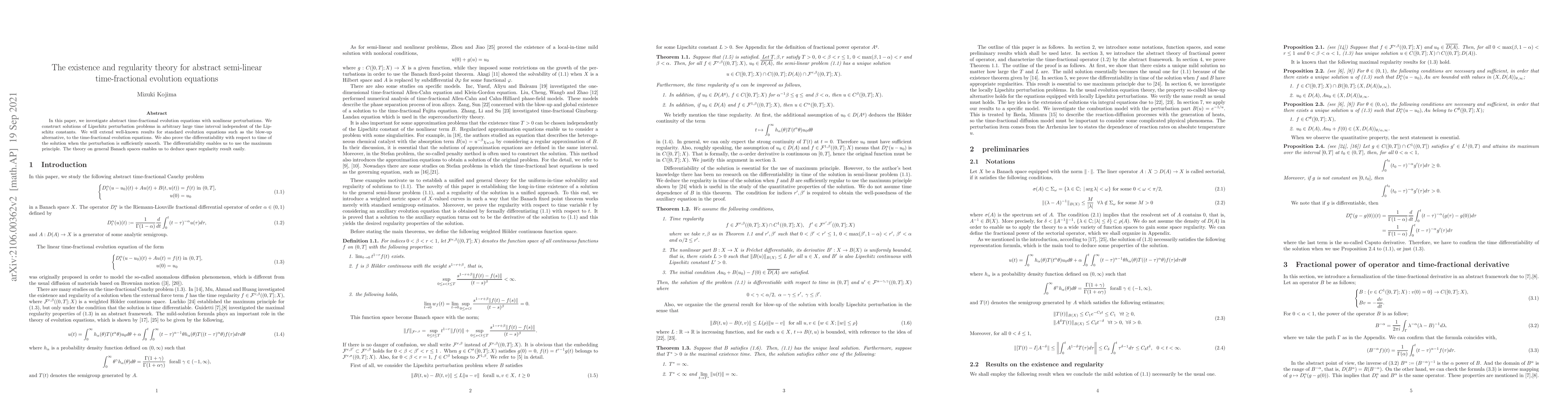 In this paper, we investigate abstract time-fractional evolution equations with nonlinear perturbations. We construct solutions of Lipschitz perturbation problems in arbitrary large time interval independent of the Lipschitz constants. We will extend well-known results for standard evolution equations such as the blow-up alternative, to the time-fractional evolution equations. We also prove the differentiability with respect to time of the solution when the perturbation is sufficiently smooth. The differentiability enables us to use the maximum principle. The theory on general Banach spaces enables us to deduce space regularity result easily.