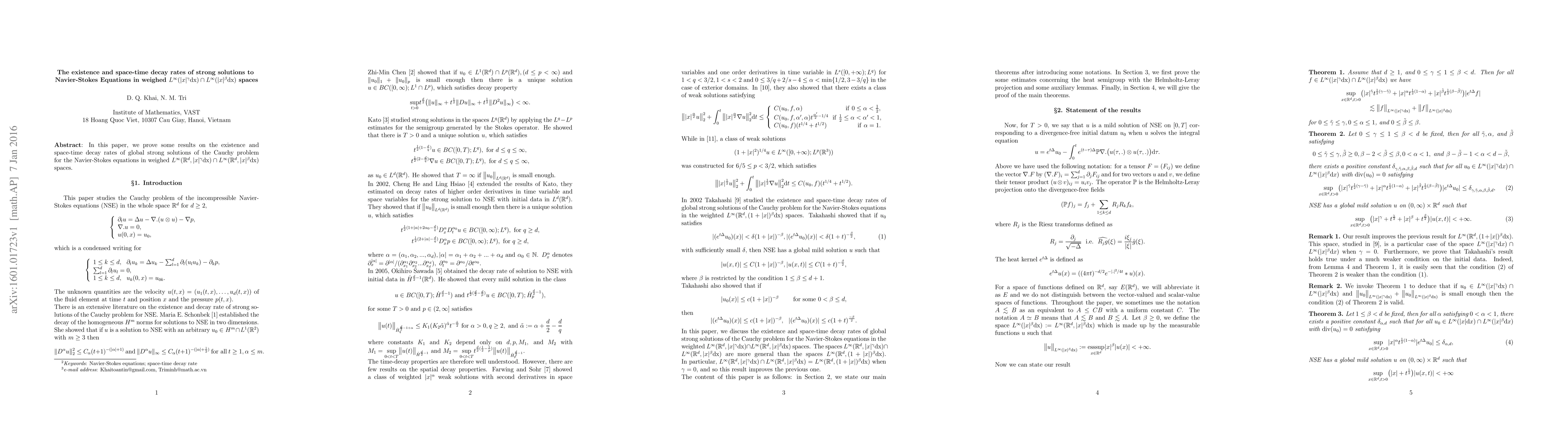 This paper establishes the existence and space-time decay rates of global strong solutions to the Navier-Stokes equations within specific weighted $L^\infty$ spaces, providing insights into the behavior of these solutions in terms of their spatial and temporal decay.