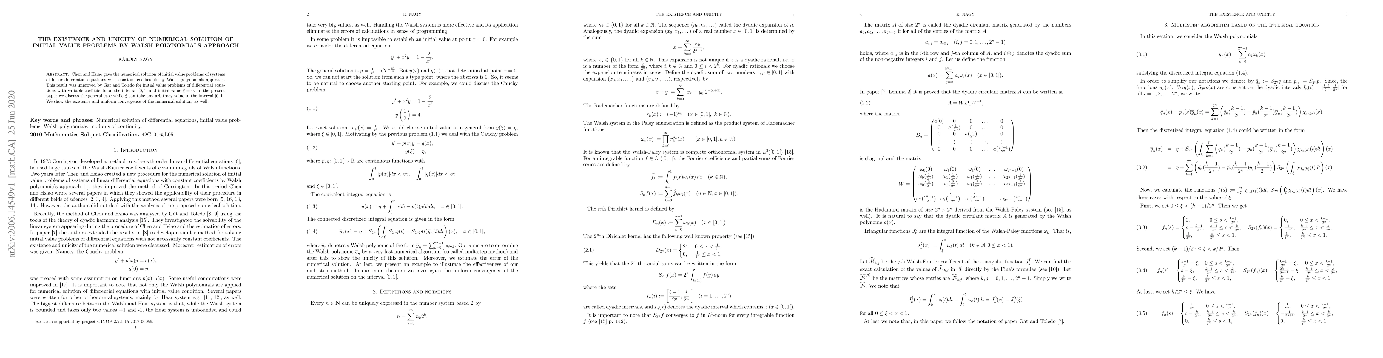 Chen and Hsiao gave the numerical solution of initial value problems of systems of linear differential equations with constant coefficients by Walsh polynomials approach. This result was improved by G\'at and Toledo for initial value problems of differential equations with variable coefficients on the interval $[0,1[$ and initial value $\xi=0$. In the present paper we discuss the general case while $\xi$ can take any arbitrary value in the interval $[0,1[$. We show the existence and uniform convergence of the numerical solution, as well.
