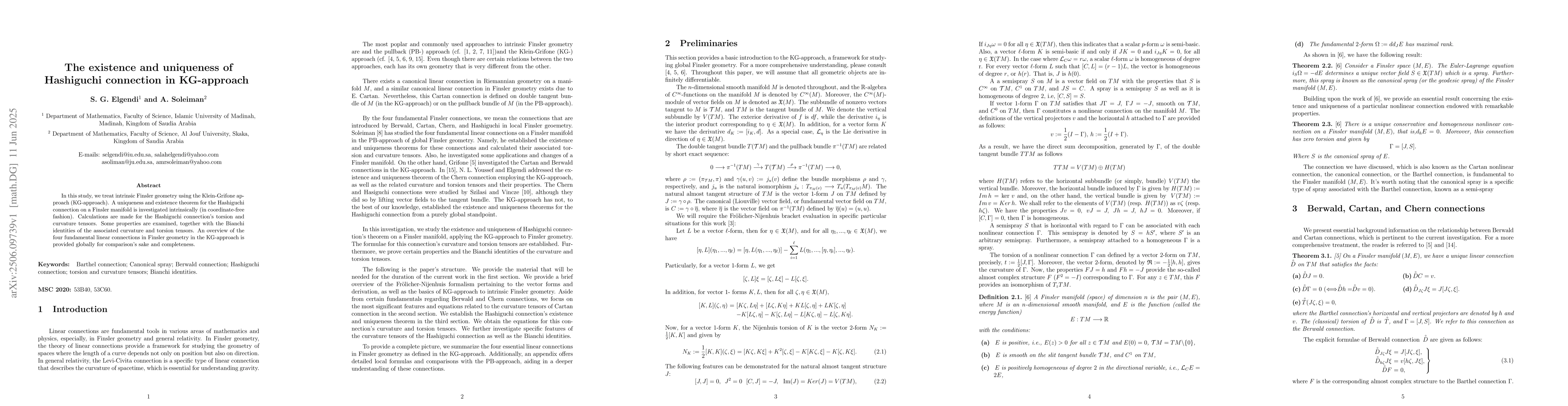 This study investigates the existence and uniqueness of Hashiguchi connection in Finsler geometry using the Klein-Grifone approach, calculating its torsion and curvature tensors and examining their properties.