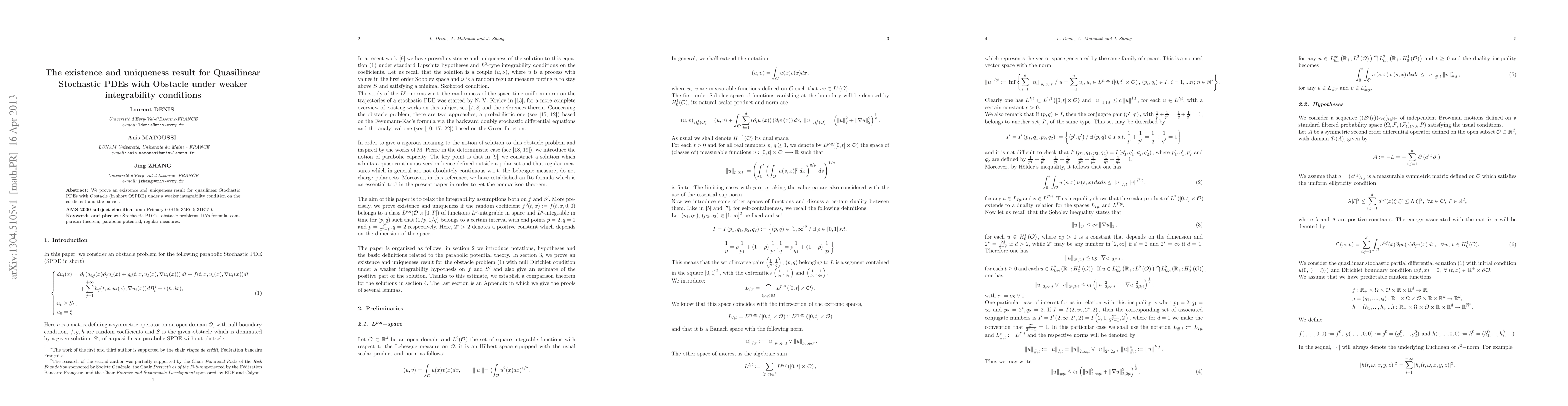 We prove an existence and uniqueness result for quasilinear Stochastic PDEs with Obstacle (in short OSPDE) under a weaker integrability condition on the coefficient and the barrier.