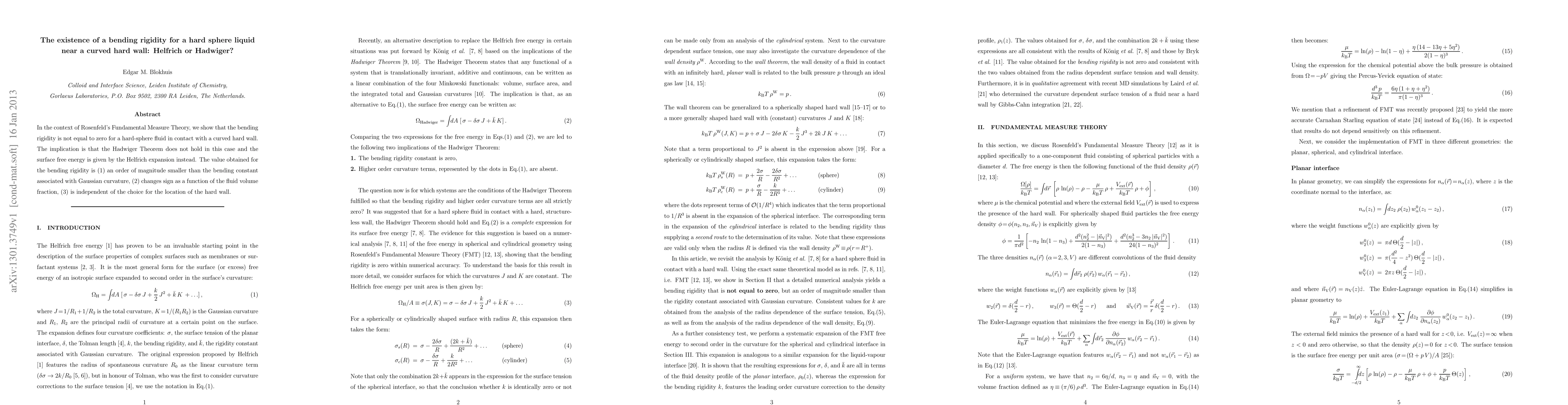 A study shows that a hard-sphere fluid near a curved hard wall exhibits non-zero bending rigidity, contradicting the Hadwiger Theorem, with implications for surface free energy calculations.